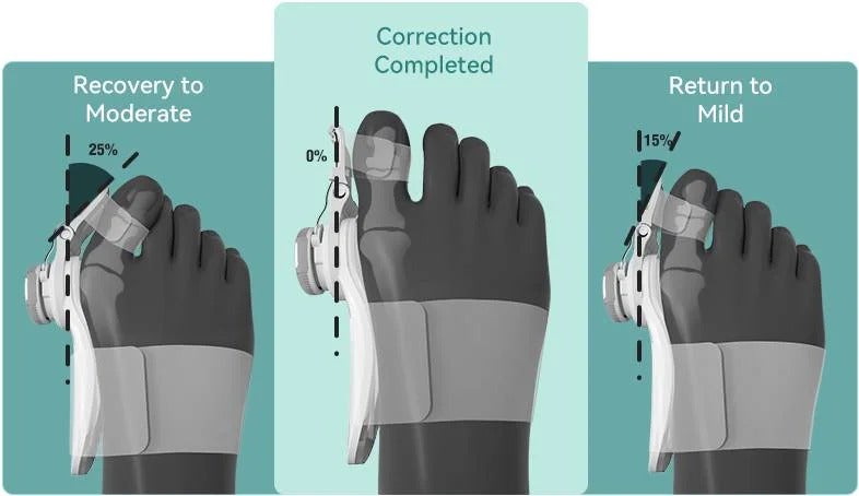This prevents further damage and bunion growth. And over the course of a month, it actually begins to restore the natural position of the toes, and reverse the damage.