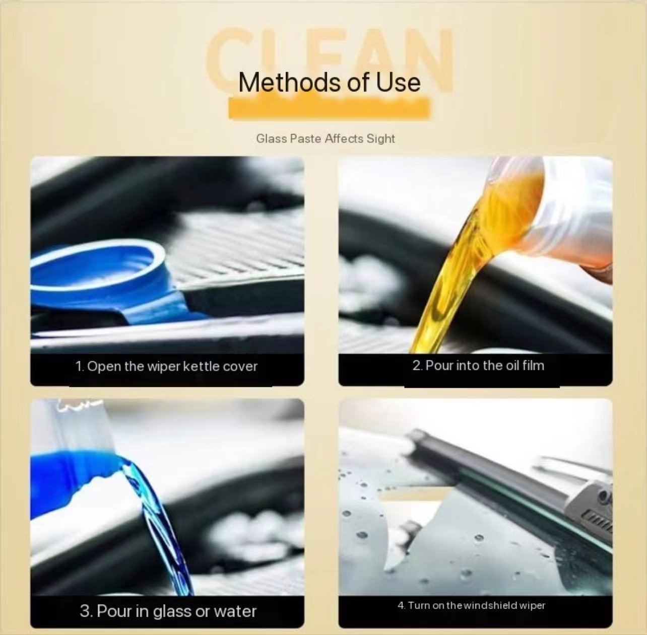 film.Eliminate oil film, water spots, waxes, tree-sap, coatings and etc. from glass, and forms protective layer to make water roll off,