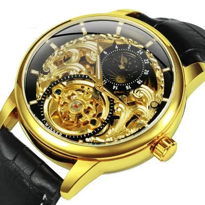 The Carved Hollow Automatic Mechanical Watch features a transparent or skeletonized dial, allowing wearers to admire the mechanical movement inside. These watches are powered by an automatic movement, meaning they wind themselves using the motion of the wearer’s wrist. The intricate engravings and hollowed-out sections on the dial and case are what make this watch so unique. Whether it's a dress watch, sports watch, or a casual everyday timepiece, the carved hollow design adds a distinctive touch to any outfit.