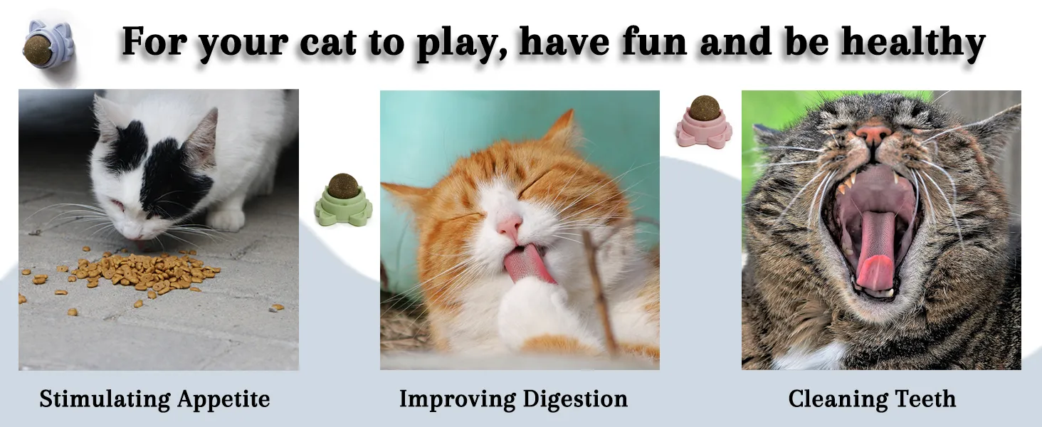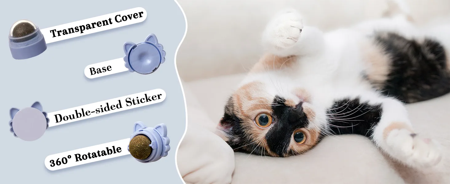 - [Practical Design]: The cat toy can easily stick to the wall or other surfaces with strong viscous force, no falling off when your kitten licks and plays. Such as wall, chair foot, floor and so on. 3 balls are 360° rotatable when being licked.