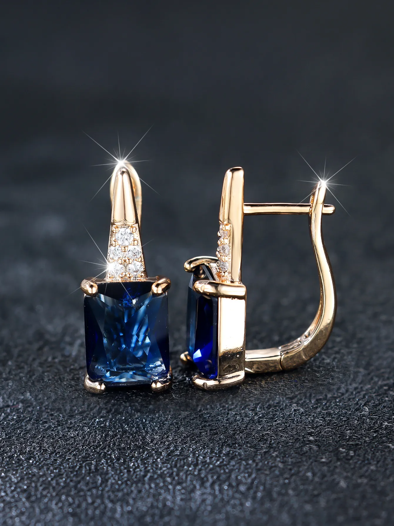 Champagne Gold Rectangular Chamfered Sapphire Blue Earrings For Women