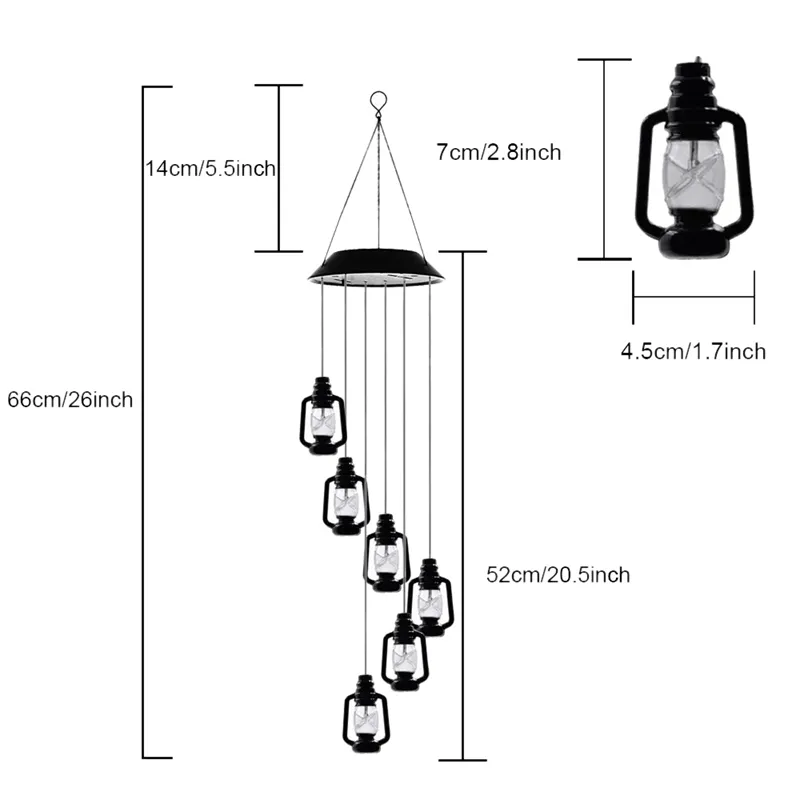 The solar-powered feature ensures that this wind chime requires no external power source or wiring, making it a convenient and sustainable lighting solution for your outdoor space. The solar panel absorbs sunlight during the day and powers the LED lanterns at night, offering long-lasting illumination without the hassle of batteries or electrical cords. Enjoy the beauty of these color-changing lanterns while reducing your environmental impact.