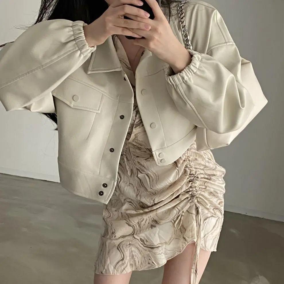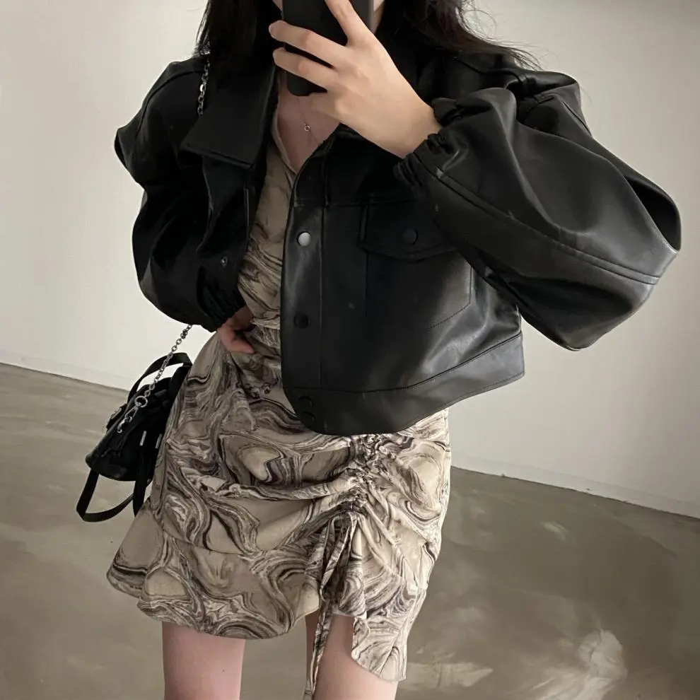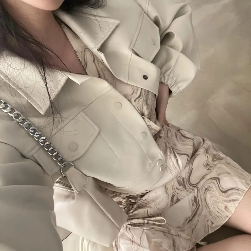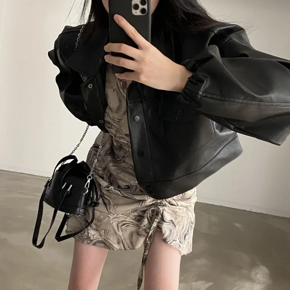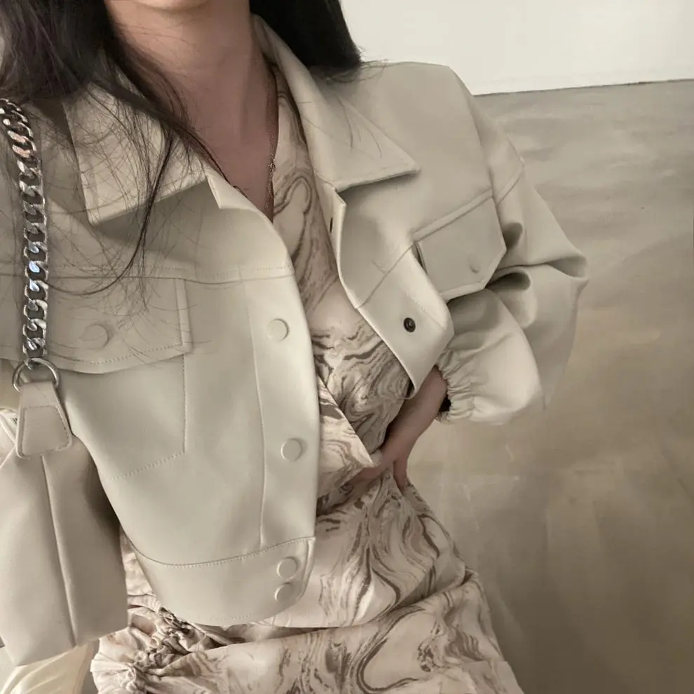 Chic Lapel Double Pocket Leather Top Leather Coat