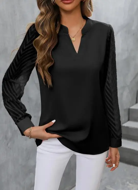 Comfort and Fit The Chiffon Patchwork Long Sleeve Solid Color and V-neck Shirt is designed with both style and comfort in mind. The loose fit allows for easy movement, making it perfect for all-day wear. The chiffon fabric is breathable and gentle on the skin, ensuring that you stay comfortable no matter the occasion. The V-neck design flatters the neckline and can be accessorized with necklaces or scarves for added style.