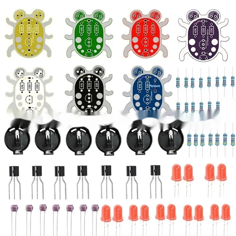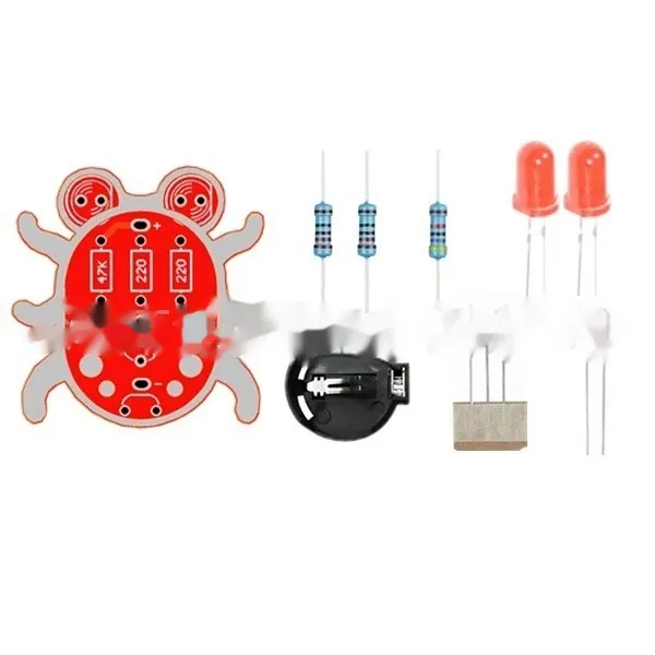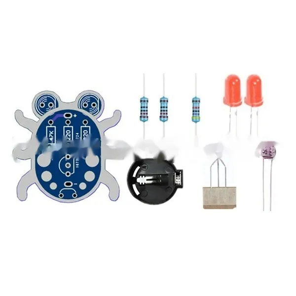 Weevil Eye PCB X 1 pc + LED lights X 2 pc + 47k ohm resistor X 1 pc + Miniature photocell X1 pc + 20mm button battery box (battery not included) X 1 pc + 2N3904 transistor X 1 pc + 220 ohm resistance X 2 pc Product Image: