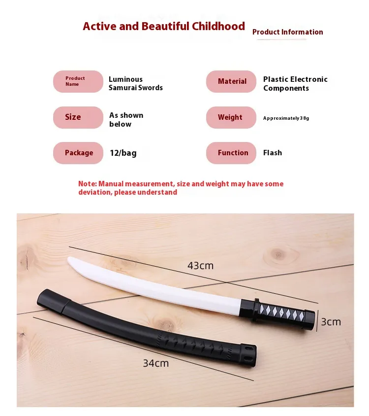 The Children’s Small Size Luminous Samurai Sword Toy is designed with both fun and safety in mind. The lightweight, compact size makes it easy for children to wield, ensuring they can safely enjoy hours of active play. The glowing feature adds an extra layer of excitement, making it perfect for playtime both indoors and outdoors, especially during nighttime adventures or parties.
