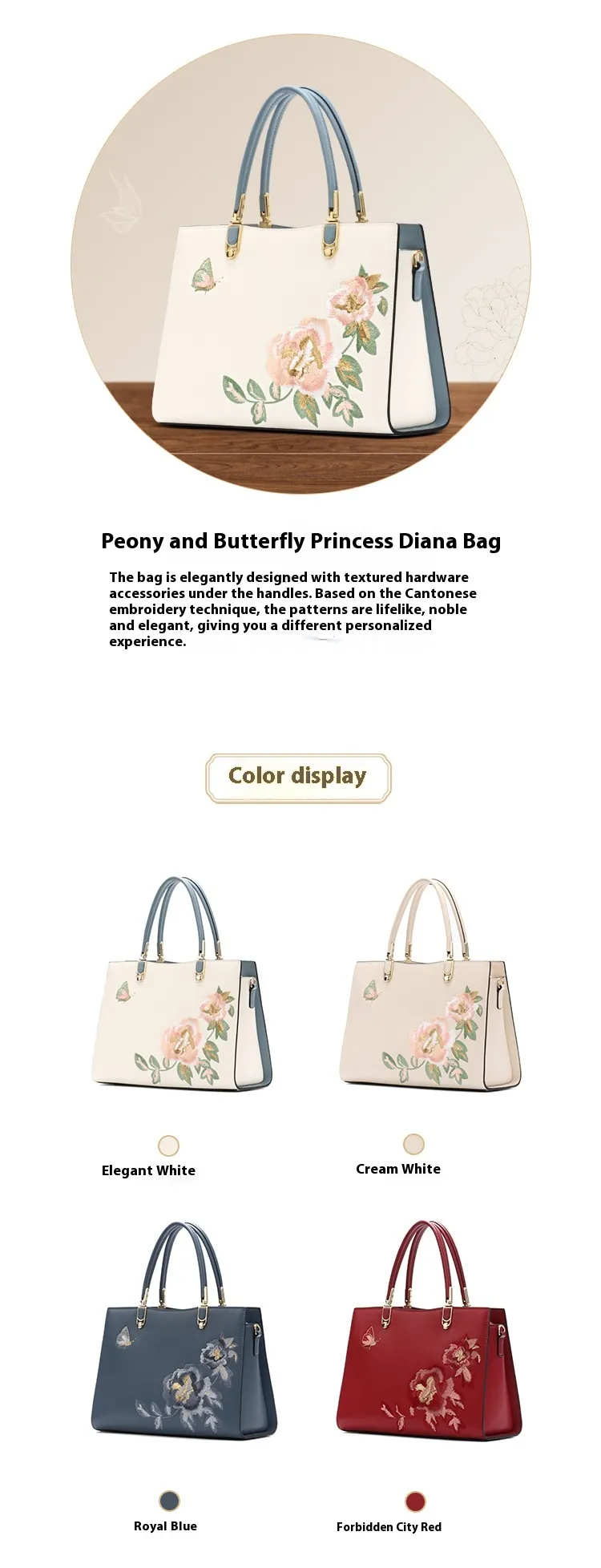 Chinese Peony Butterfly Leather Graceful and Fashionable Large Capacity Embroidery Texture Diana Bag: Elegance Meets Functionality