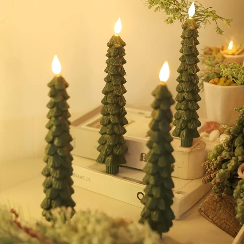 - Christmas Tree Design - Real wax made, lifelike leaves, 3D flickering flame, all these Christmas Tree taper candles can bring you the classic cozy household atmosphere of quiet comfortable warmth without any drips, smoke, or flames, perfect for winter holidays and Christmas!