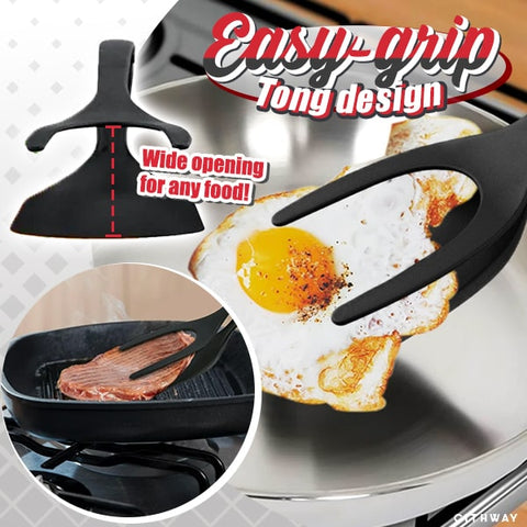 A unique spatula tool that is expertly-crafted in a tong-like design to deliver an easier and better food gripping, flipping,