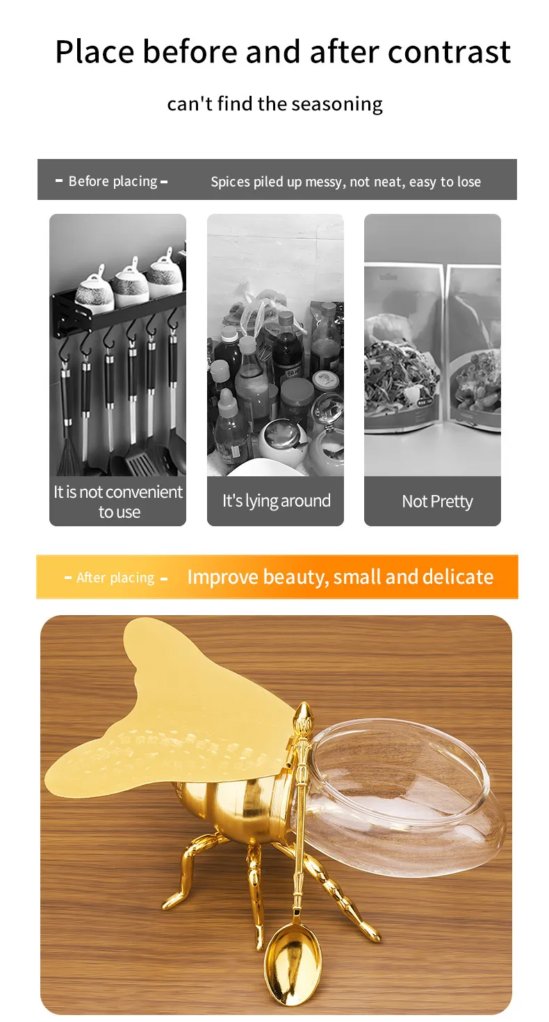 Enhance the beauty and functionality of your kitchen with the Classical Style Bee Sugar Bowl and Seasoning Jar with Spoon. Designed with intricate metal craftsmanship, this charming kitchen gadget is the perfect way to store and serve sugar, spices, or seasoning blends in style. Featuring a delightful bee design that adds a touch of whimsy and elegance, this sugar bowl and seasoning jar is a must-have for anyone looking to elevate their kitchen decor while maintaining practicality.