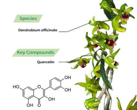 Dendrobium officinale: Dendrobium officinale is a medicinal material widely used in natural therapy in Japan in recent years. Its rhizome is rich in Quercetin, which can enhance the respiratory function of the lungs and clean up the residual waste and toxins in the respiratory system. Due to its special chemical properties, It can resist the release of histamine, greatly reduce the occurrence of allergies/asthma, and prevent inflammation of the sinuses/trachea.