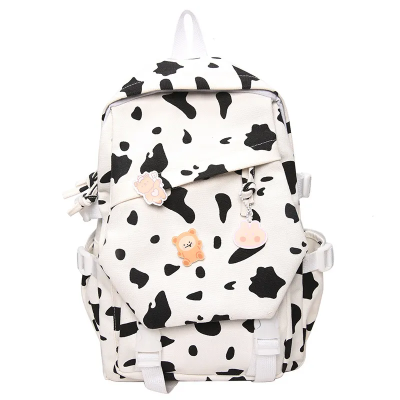The cow print and Korean-inspired aesthetic make this backpack a fashionable accessory that stands out from the crowd.