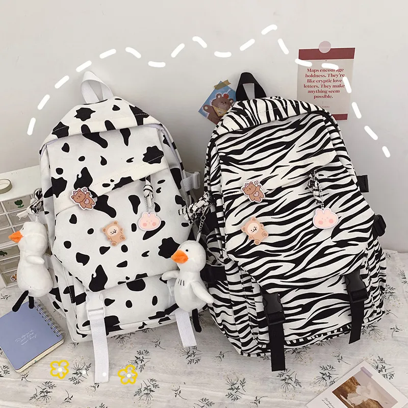 The cow print and Korean-inspired aesthetic make this backpack a fashionable accessory that stands out from the crowd.
