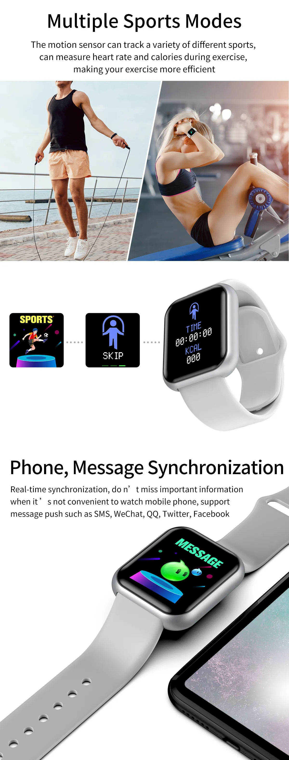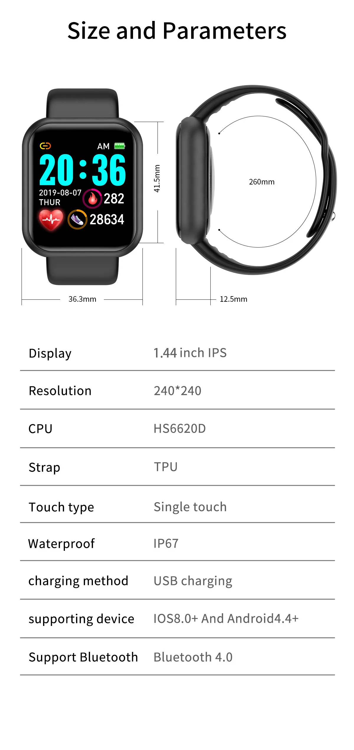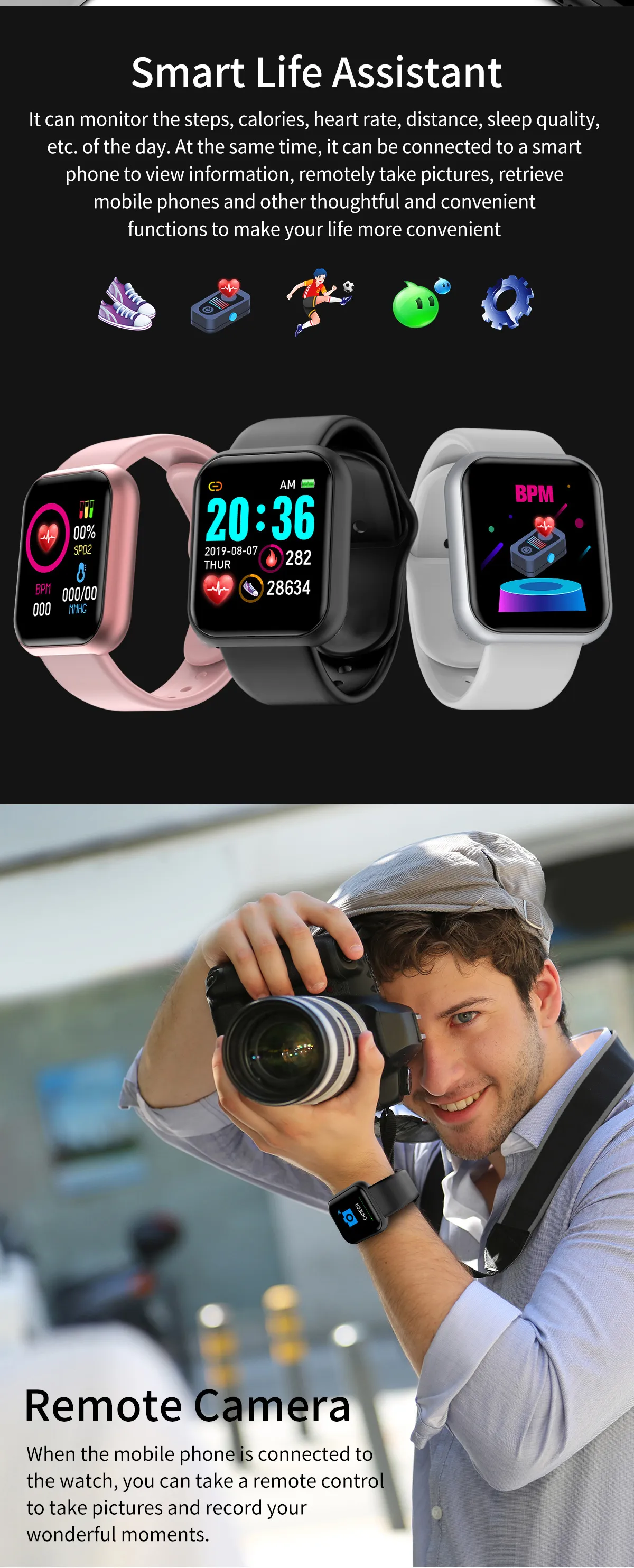 Additional features: step counting, social entertainment, smart reminders, remote control selfies, health monitoring, information push,