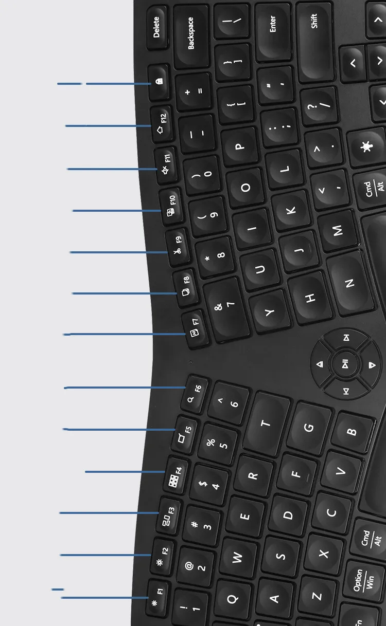 Layout of the keys according to the natural hanging posture of the wrist, and the curvature of the key surface
