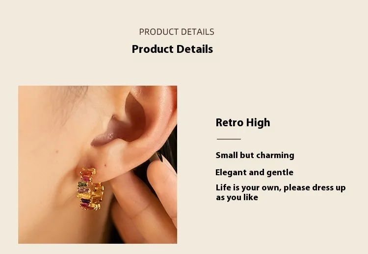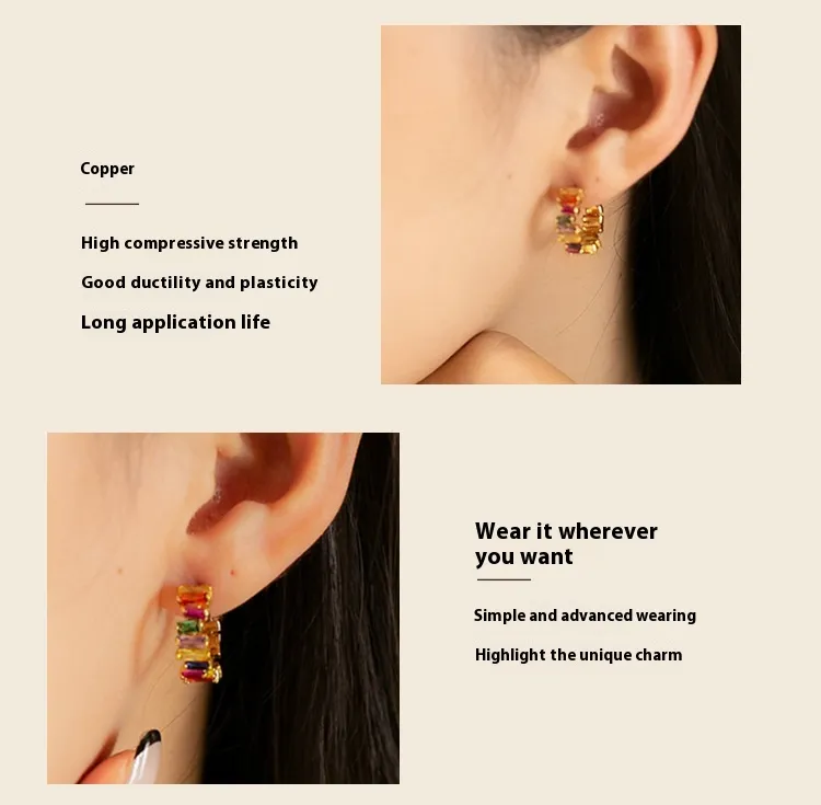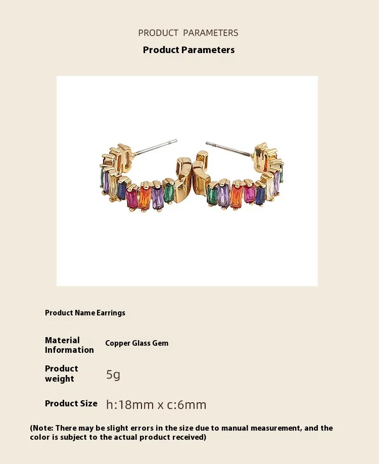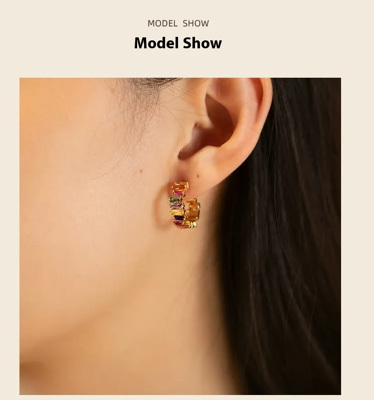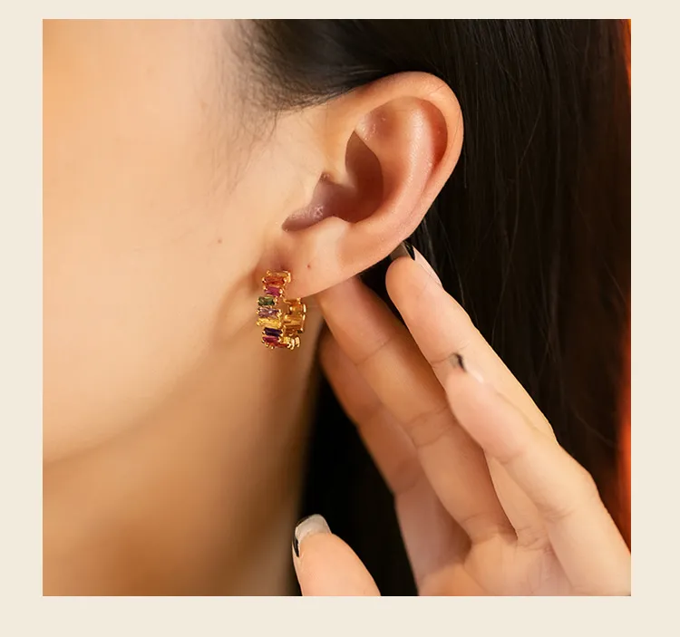 Colorful Zircon 18K Real Gold Rainbow C- Shaped Earrings