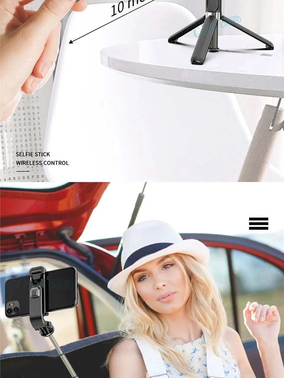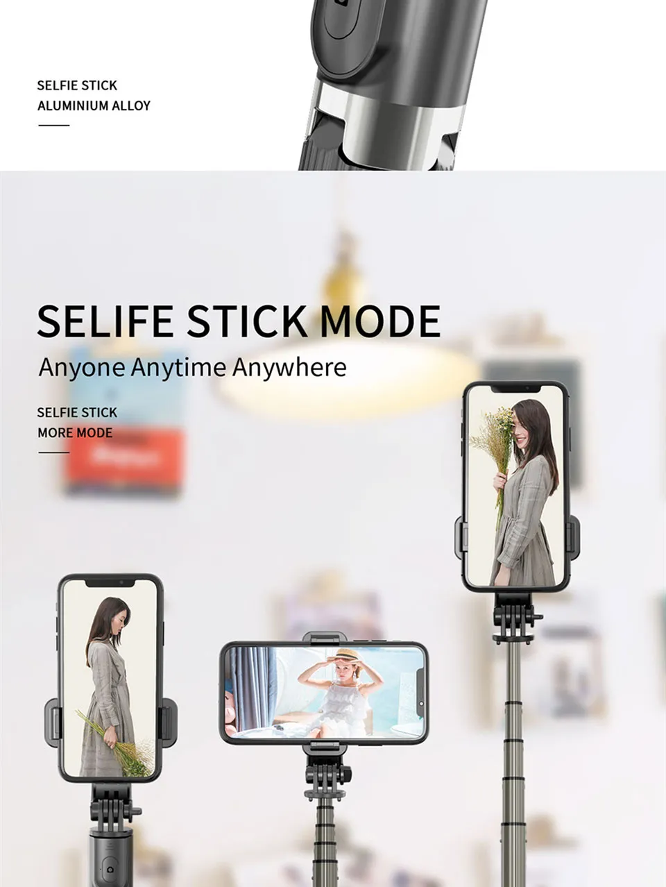 - Extendable selfie stick for adjustable height and angles
