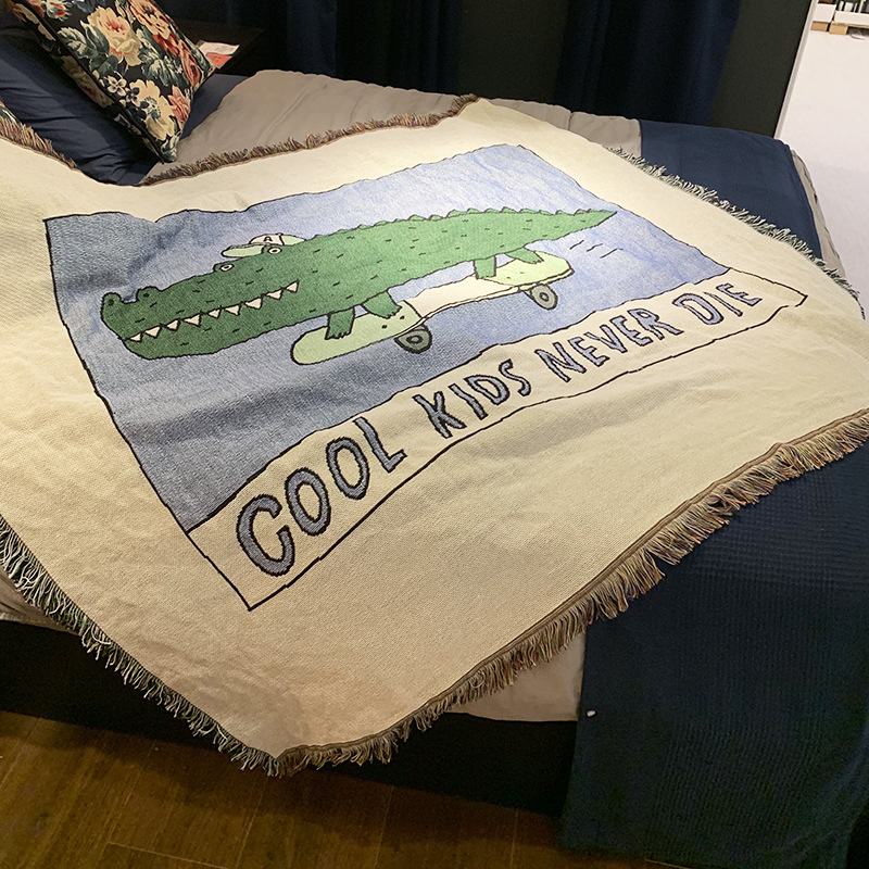 Introducing the Cool Croc Adventure Throw Blanket – a perfect blend of fun and comfort for kids and adults alike! This vibrant throw blanket features a playful green crocodile design accompanied by the phrase "Cool Kids Never Die," making it an instant favorite for anyone who loves a touch of whimsy in their decor.