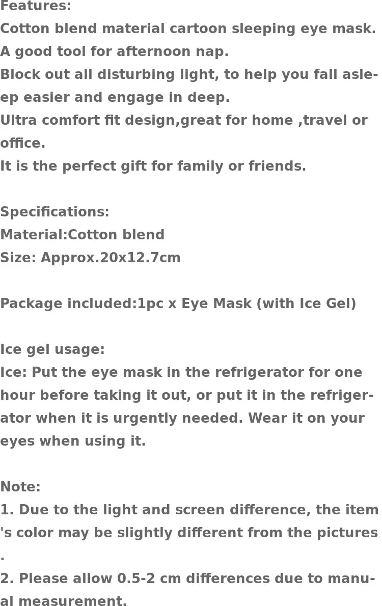 With a charming cartoon character design, this sleep mask is both playful and comforting. Its lighthearted appearance makes it a delightful addition to your relaxation routine, adding a touch of fun to your self-care practices.