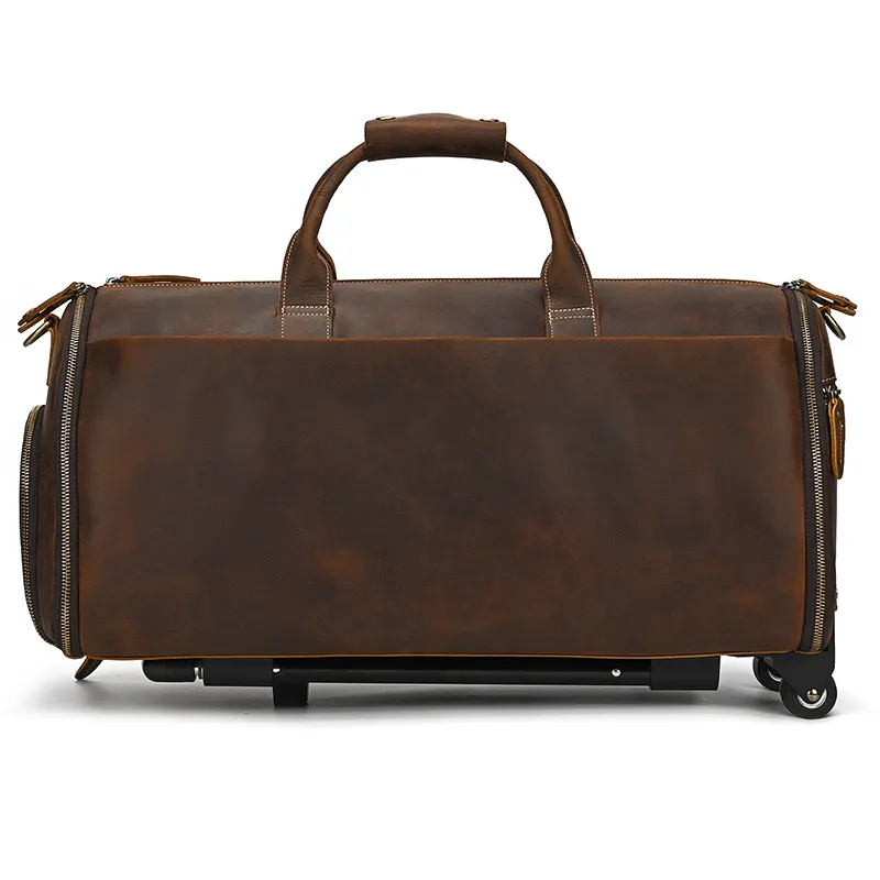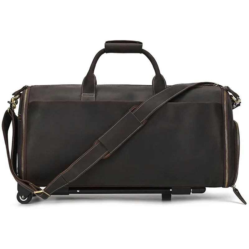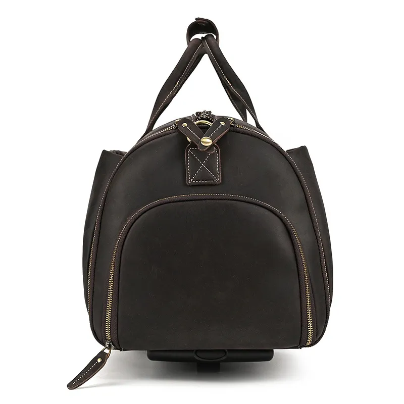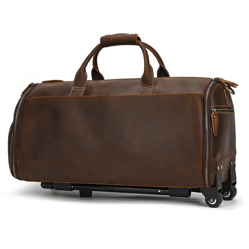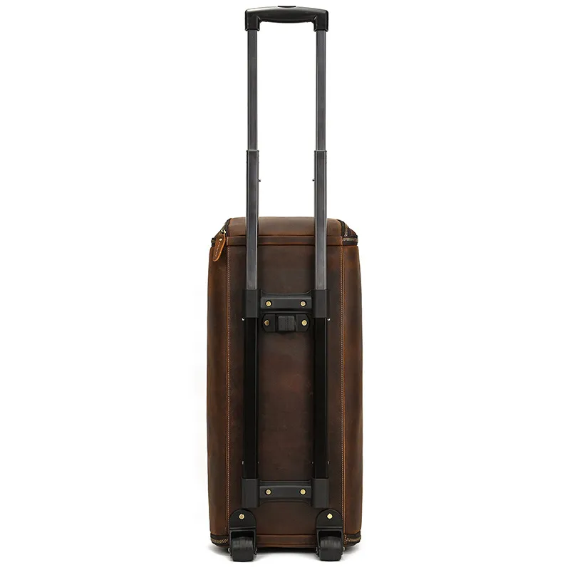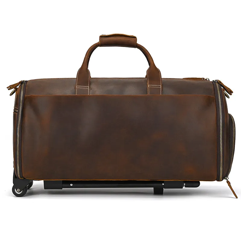 Experience luxury and practicality with the Crazy Horse Leather Trolley Bag, expertly crafted for the discerning traveler. This 22-inch bag is made from high-quality Crazy Horse leather, known for its durability and unique, rustic appeal. The leather not only provides a sophisticated look but also ages beautifully, developing a rich patina over time that adds character to your travels. Designed with large capacity in mind, this trolley bag is perfect for weekend getaways, business trips, or extended vacations.The Large Capacity Leather Trolley Bag features a spacious main compartment that can easily accommodate clothing, shoes, and personal items, ensuring you have everything you need at your fingertips. The thoughtfully designed interior includes multiple pockets for organized storage of smaller essentials, making it easy to access your items on the go. The trolley bag's sturdy wheels and telescoping handle provide effortless maneuverability, allowing you to navigate through airports and train stations with ease.Combining functionality with style, the Crazy Horse Leather Trolley Bag is not only practical but also a statement piece. The rugged design is complemented by sturdy stitching and quality hardware, ensuring it can withstand the rigors of travel. Whether you’re embarking on a business trip or exploring new destinations, this trolley bag is the perfect companion for those who appreciate the finer things in life. Elevate your travel experience with the Crazy Horse Leather Trolley Bag, where durability meets timeless elegance.