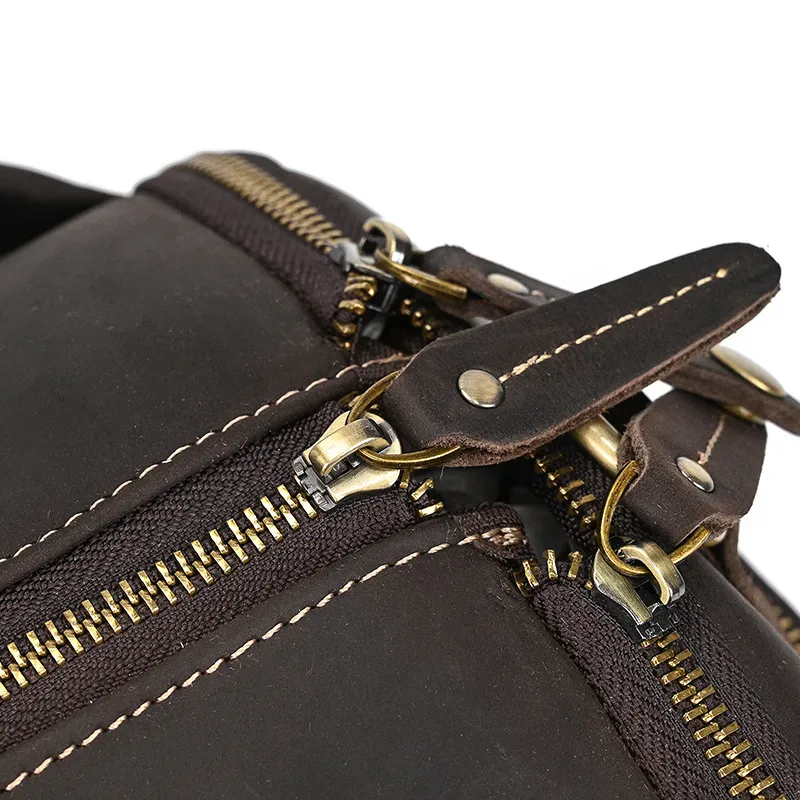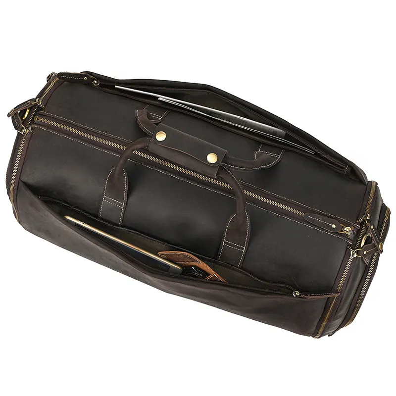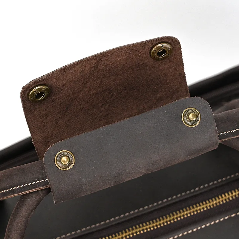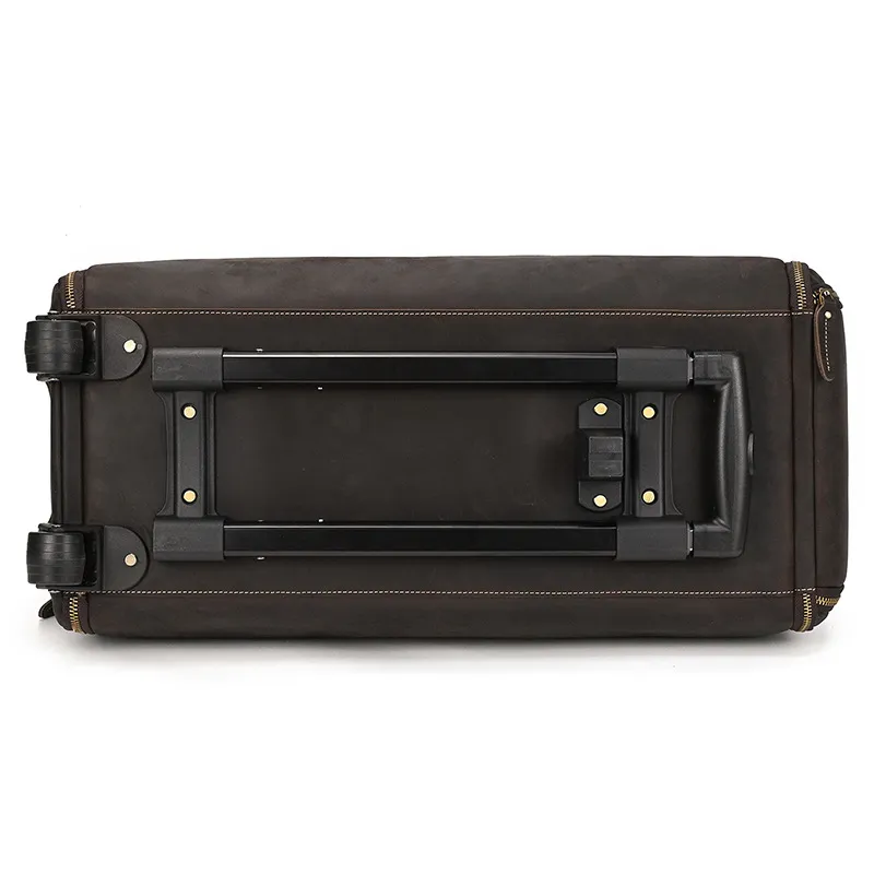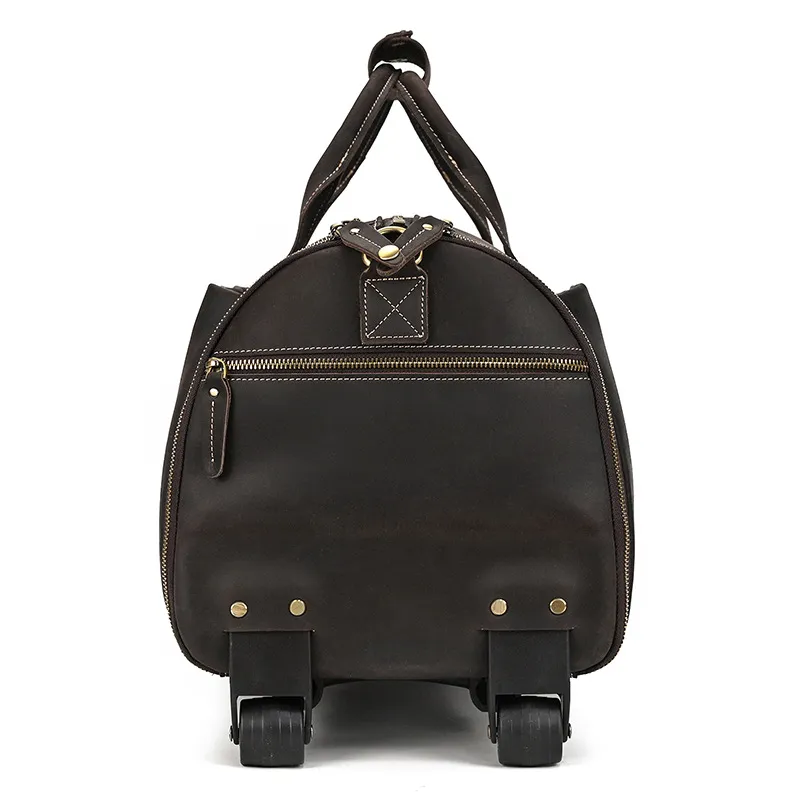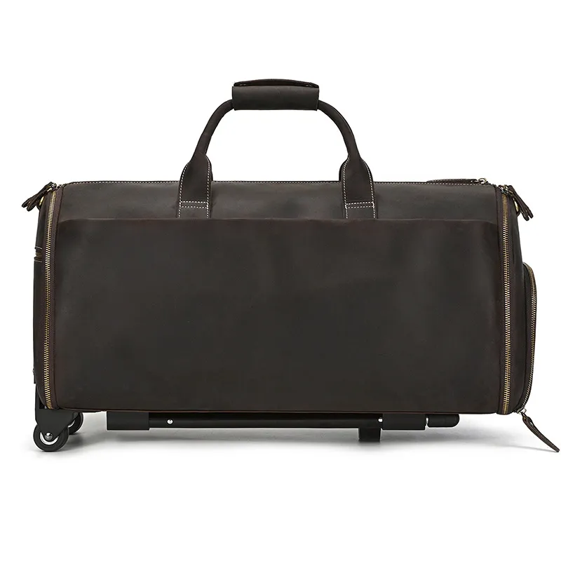 Experience luxury and practicality with the Crazy Horse Leather Trolley Bag, expertly crafted for the discerning traveler. This 22-inch bag is made from high-quality Crazy Horse leather, known for its durability and unique, rustic appeal. The leather not only provides a sophisticated look but also ages beautifully, developing a rich patina over time that adds character to your travels. Designed with large capacity in mind, this trolley bag is perfect for weekend getaways, business trips, or extended vacations.The Large Capacity Leather Trolley Bag features a spacious main compartment that can easily accommodate clothing, shoes, and personal items, ensuring you have everything you need at your fingertips. The thoughtfully designed interior includes multiple pockets for organized storage of smaller essentials, making it easy to access your items on the go. The trolley bag's sturdy wheels and telescoping handle provide effortless maneuverability, allowing you to navigate through airports and train stations with ease.Combining functionality with style, the Crazy Horse Leather Trolley Bag is not only practical but also a statement piece. The rugged design is complemented by sturdy stitching and quality hardware, ensuring it can withstand the rigors of travel. Whether you’re embarking on a business trip or exploring new destinations, this trolley bag is the perfect companion for those who appreciate the finer things in life. Elevate your travel experience with the Crazy Horse Leather Trolley Bag, where durability meets timeless elegance.