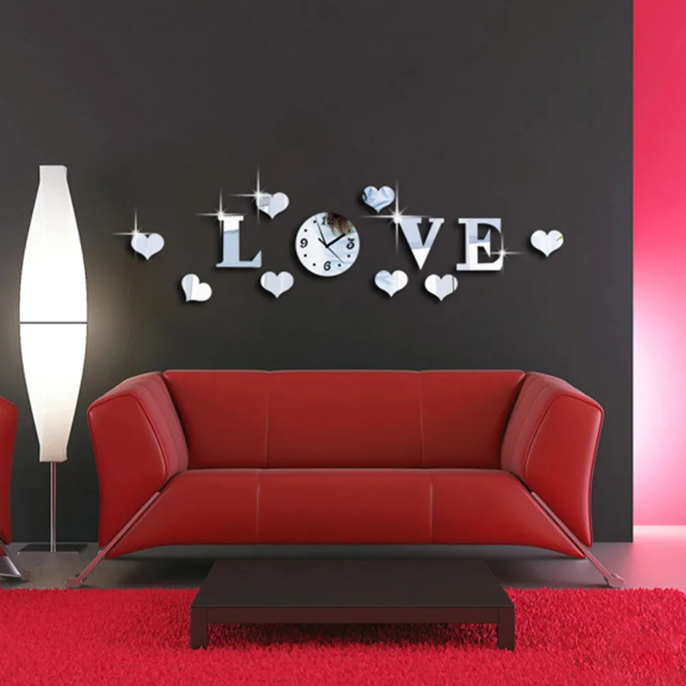 Creative Diy Letter Heart-shaped Mirror Clock Home Decoration