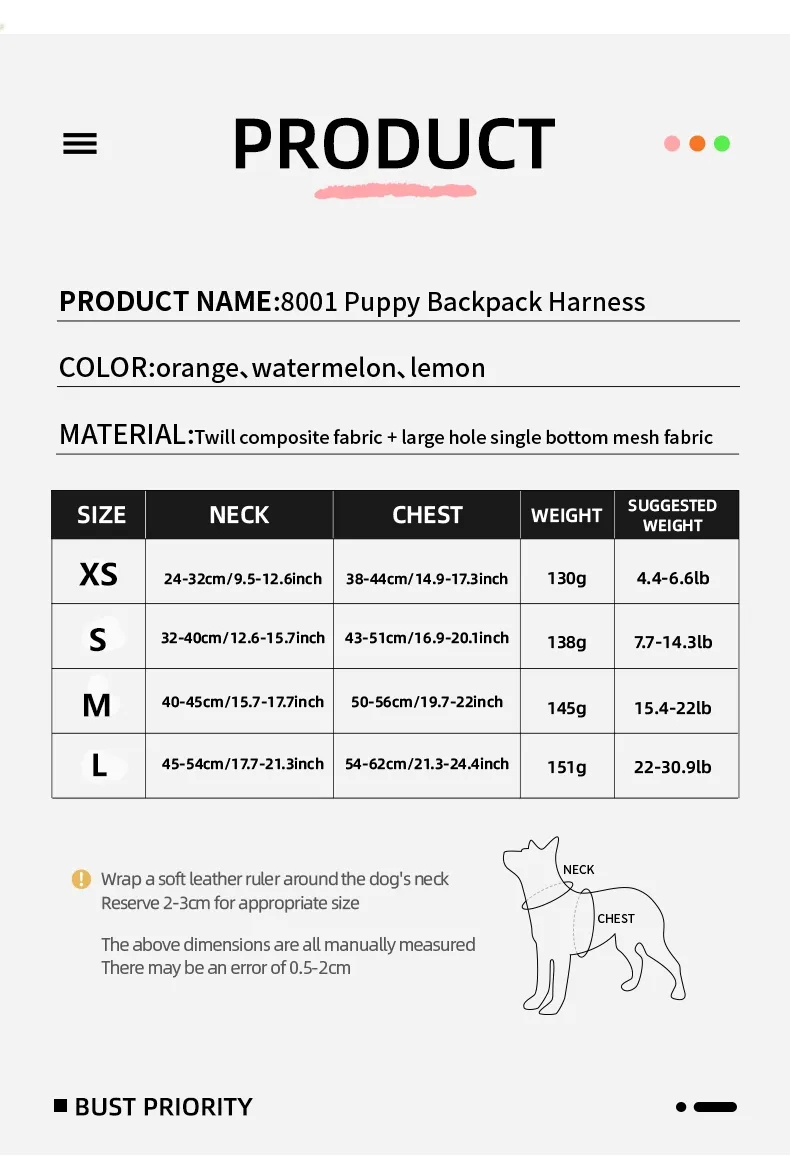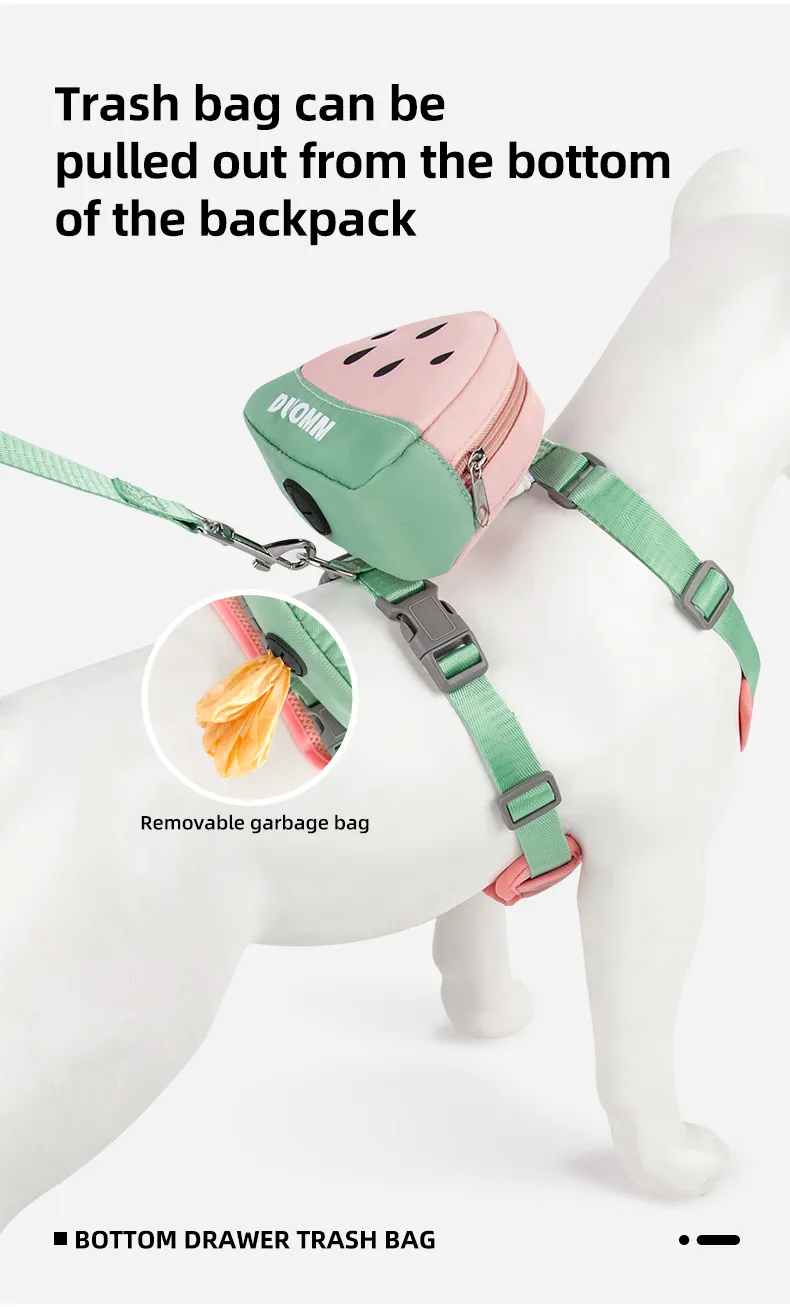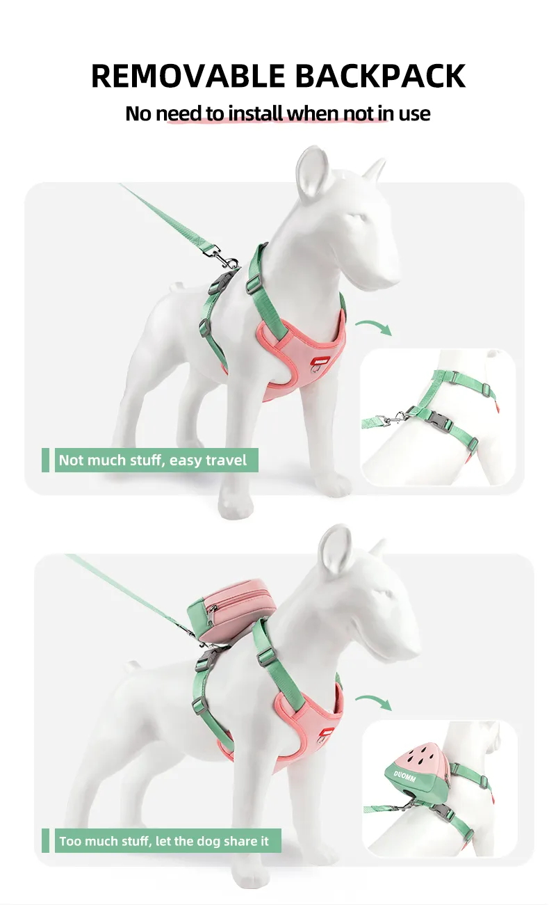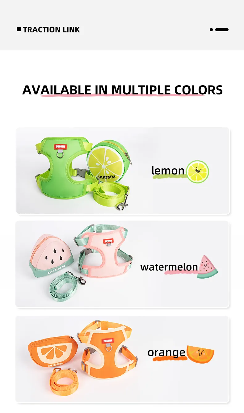 The matching fruit backpack adds a playful and practical element to the set, providing a small storage space for treats, waste bags, or small accessories. The vibrant and cute fruit design not only makes your pet stand out but also adds a delightful aesthetic to your pet’s look, making it perfect for walks in the park, pet-friendly events, or casual outings. The traction rope is designed to match the chest strap, providing a consistent look while offering durability and strength for safe walks. This set is ideal for pets who love outdoor adventures, providing both style and function in one complete package.