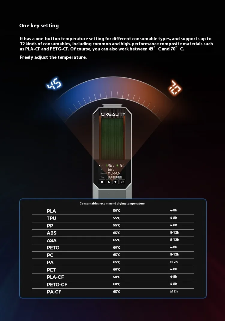 With customizable temperature controls, this box allows you to set the perfect drying conditions for various filament types, including PLA, ABS, TPU, PETG, and more.