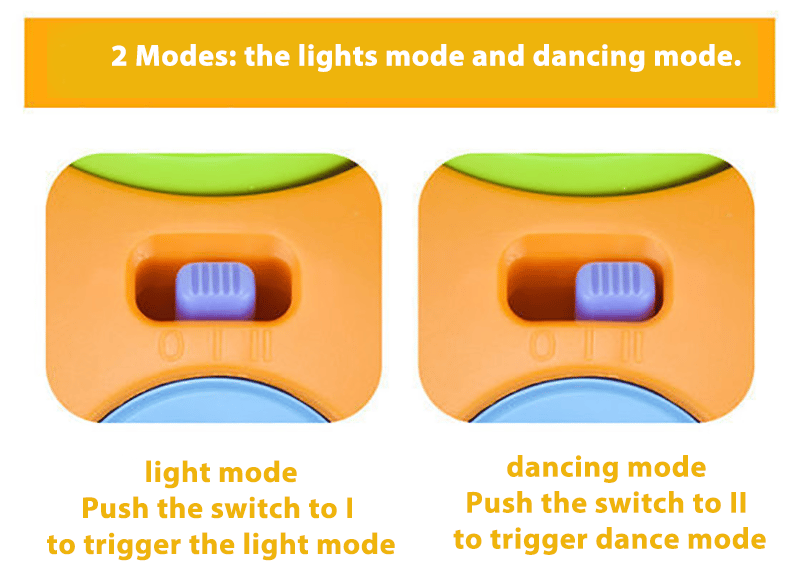 - 2 Modes:Â The toy features 2 modes, including the lights mode and dancing mode. Push the switch to the 1st position, and the colored lights flash, push the switch to the 2nd position, the toy wiggles and dances with the lights and sounds.