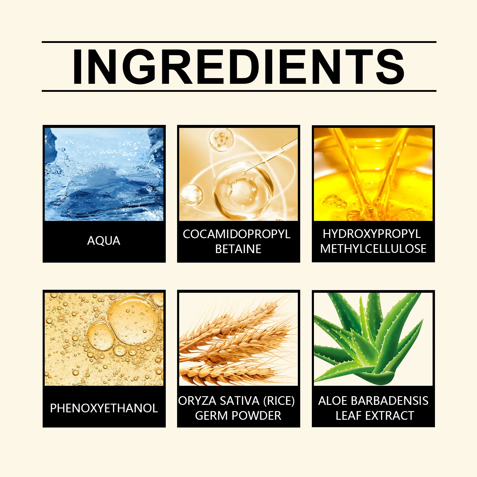 Ingredients: water, coconut oil amidopropyl betaine, rice germ flour hydroxypropyl methyl cellulose, phenoxyethanol, aloe extract