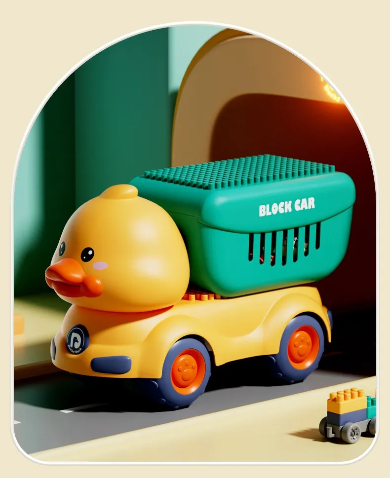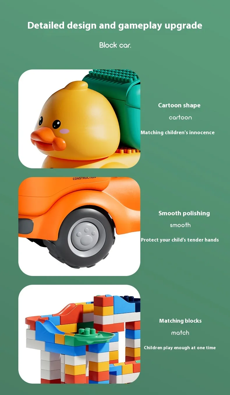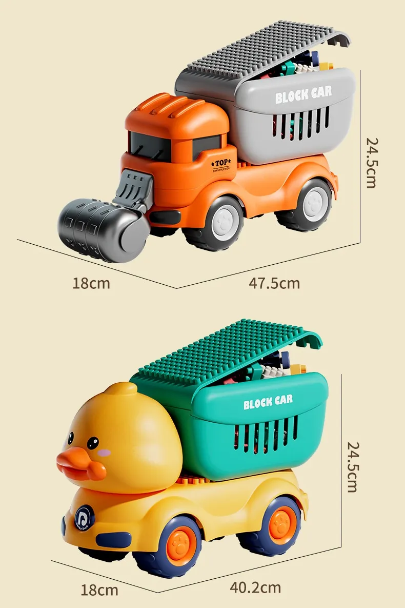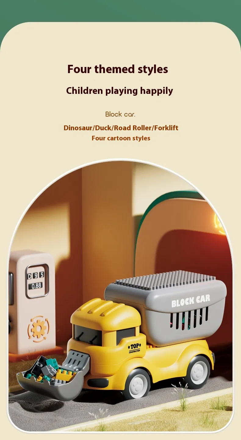 Color: Dinosaur unit block on wheels, cute duck unit block on wheels, shovel unit block on wheels, pressure Road unit block on wheels