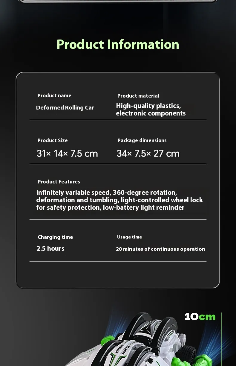 Function: infinite speed change, 360 degree rotation, deformation and rolling, light control