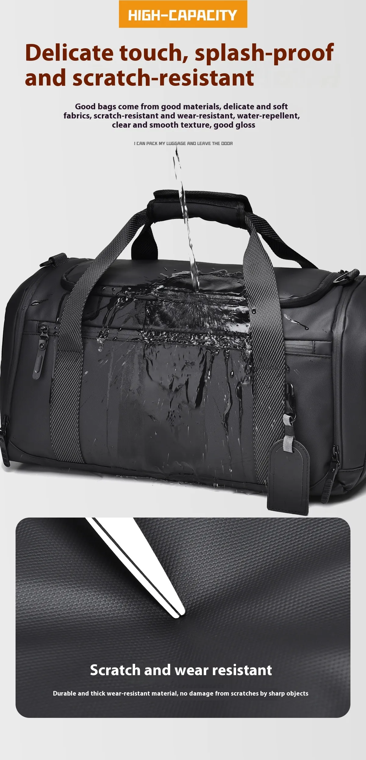 - Constructed from high-quality, water-resistant materials, this bag is designed to withstand the rigors of travel. The fabric is both durable and easy to clean, ensuring that your bag will last for years to come. Whether you're trekking through rainy weather or transporting your bag in a humid environment, the bag's waterproof features ensure your belongings stay dry and protected.