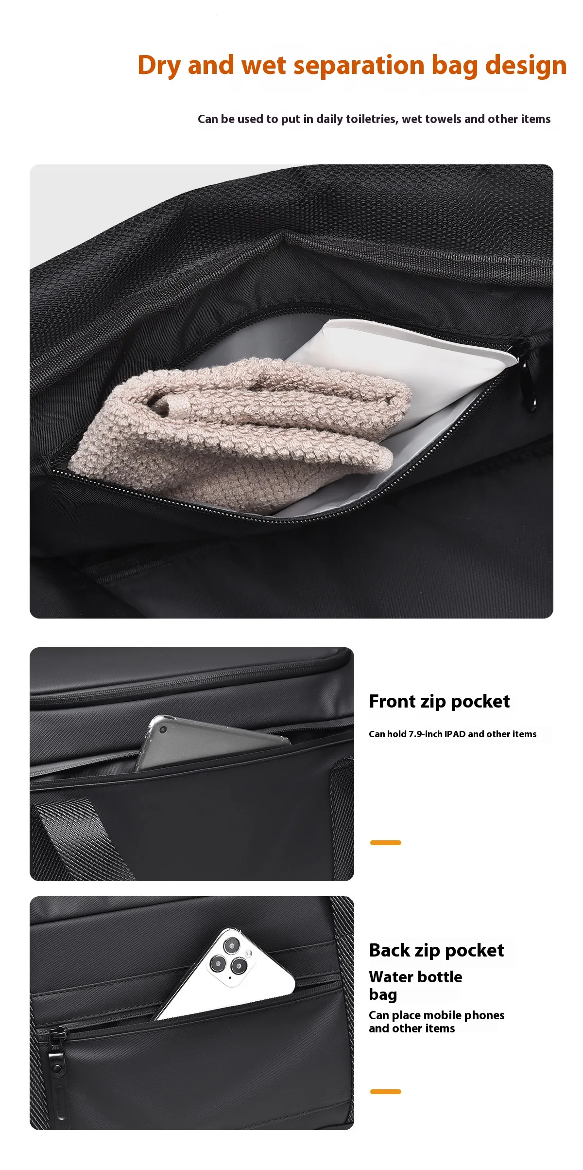 - One of the standout features of this travel luggage bag is its dry wet separation design. With a special compartment dedicated to storing wet or dirty shoes, towels, or clothes, this feature ensures your clean clothing and personal items remain free from any moisture or odors. This compartment is made from waterproof materials, preventing any liquids or dirt from seeping into the rest of your belongings.