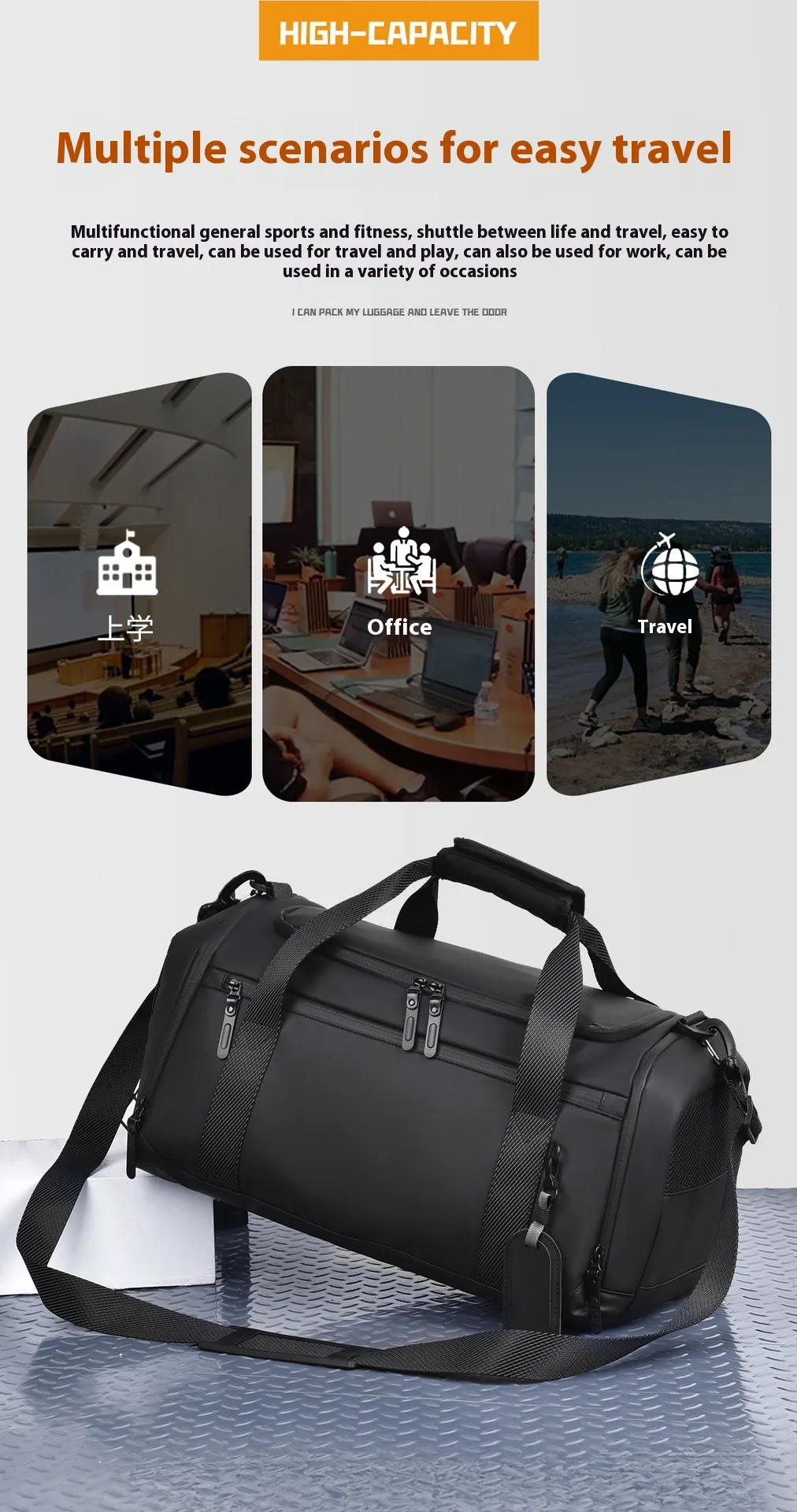 - This large capacity handbag offers ample space to fit all your travel essentials. Whether you’re packing for a short weekend trip or a longer journey, this bag can accommodate a wide range of items. The main compartment is roomy enough to fit clothes, toiletries, and other necessities, while the shoe compartment offers extra space for your footwear.