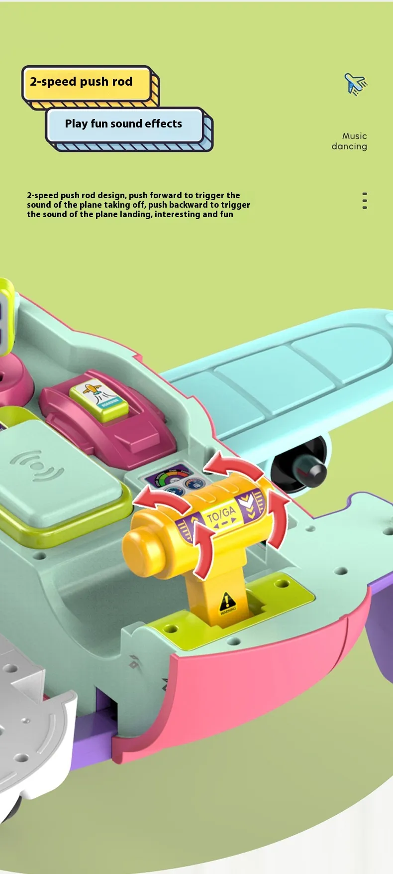The toy is equipped with colorful lighting and cheerful music that activates when children interact with it. These light and sound effects
