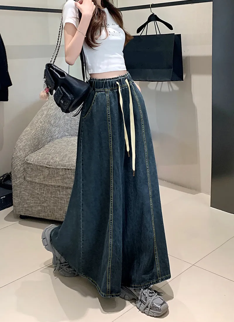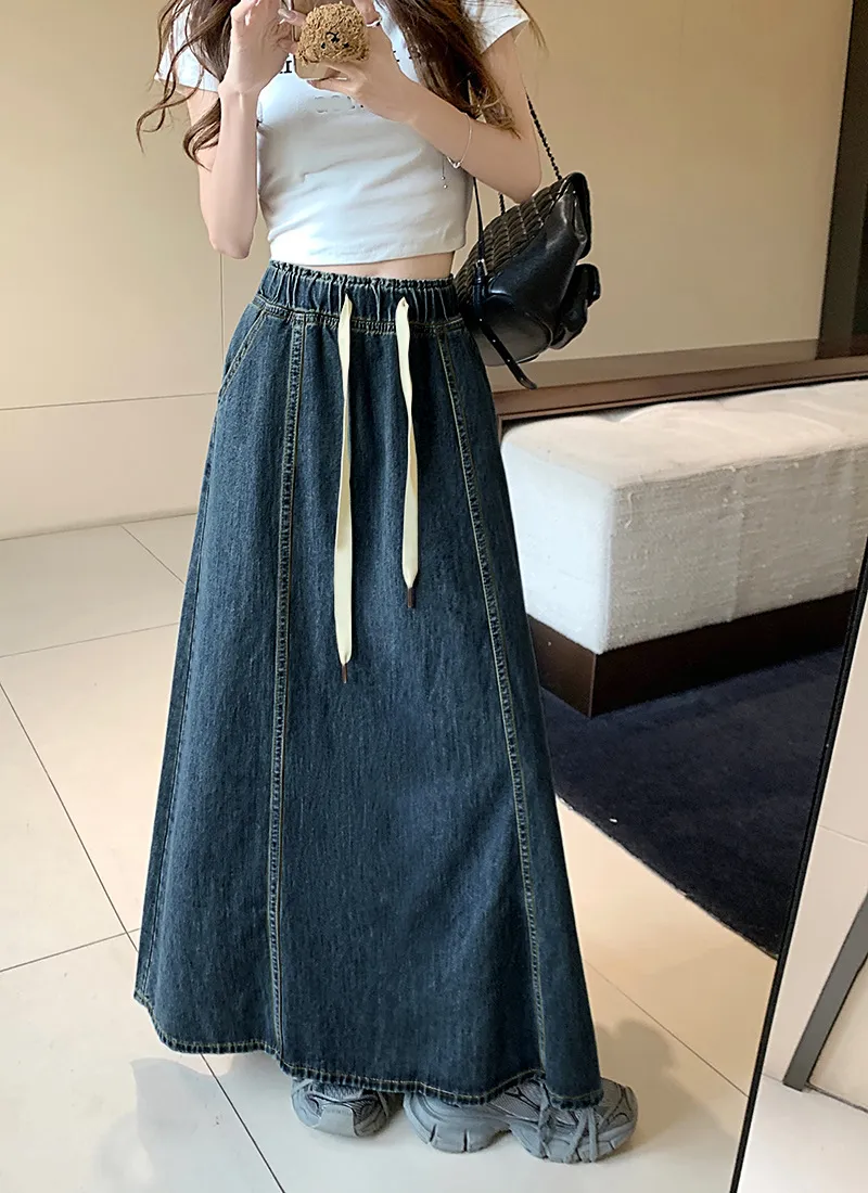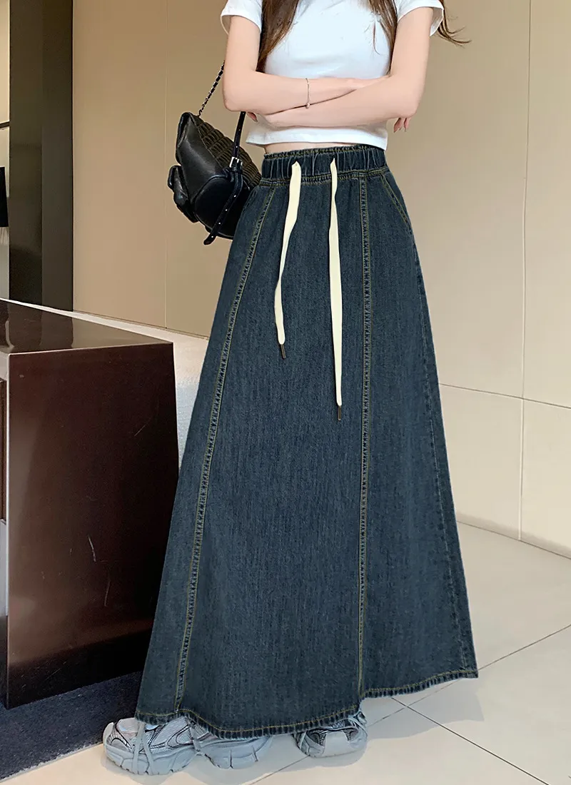 The A-line silhouette of the skirt ensures a flattering shape for all body types, elongating the legs and providing a relaxed yet stylish fit. The drawstring detail adds a modern touch to the classic denim design, making it a standout piece in any wardrobe.