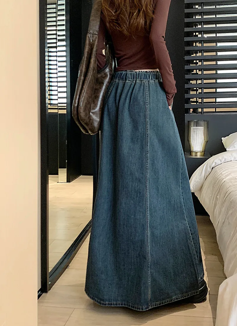 The rich dark blue denim color gives this skirt a sophisticated yet casual vibe, perfect for all types of occasions. From casual gatherings to everyday wear, the dark wash provides versatility and ease in pairing with different tops and accessories.