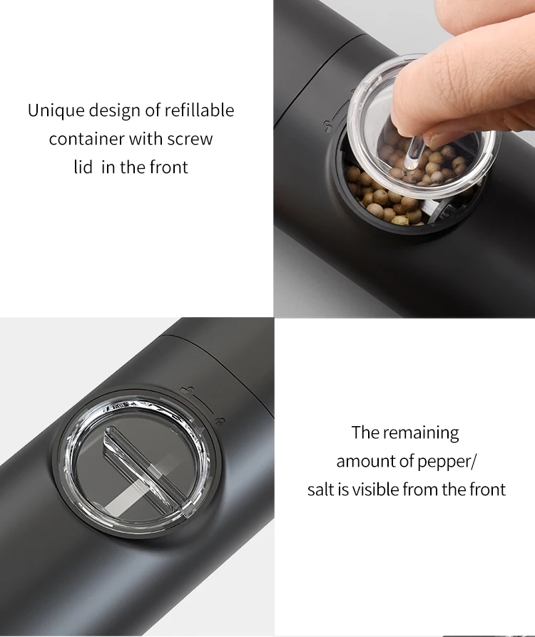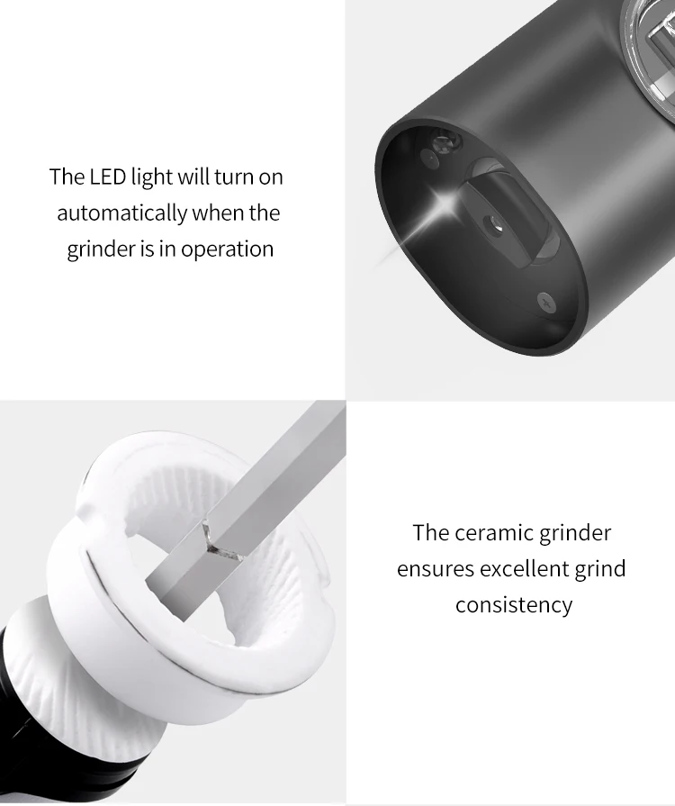 seasoning with ease. This electric grinder is equipped with a bright LED light, allowing you to see exactly where and how much seasoning is
