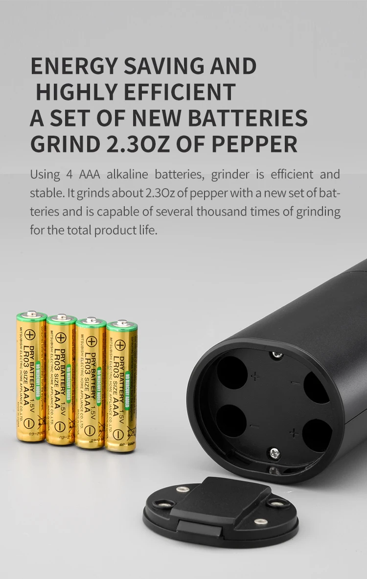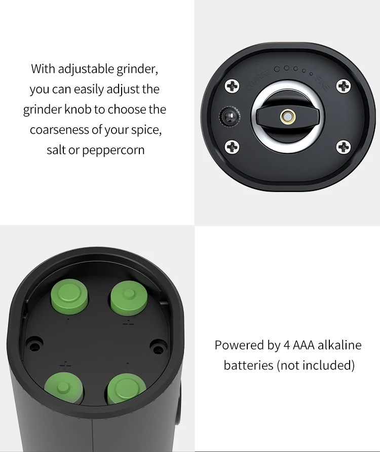 5.Battery Powered: Fill with 4 x AAA batteries as per instructions before use (batteries are not included), which provide strong power for the pepper mill, you don't have to spend a lot of manual grinding.
