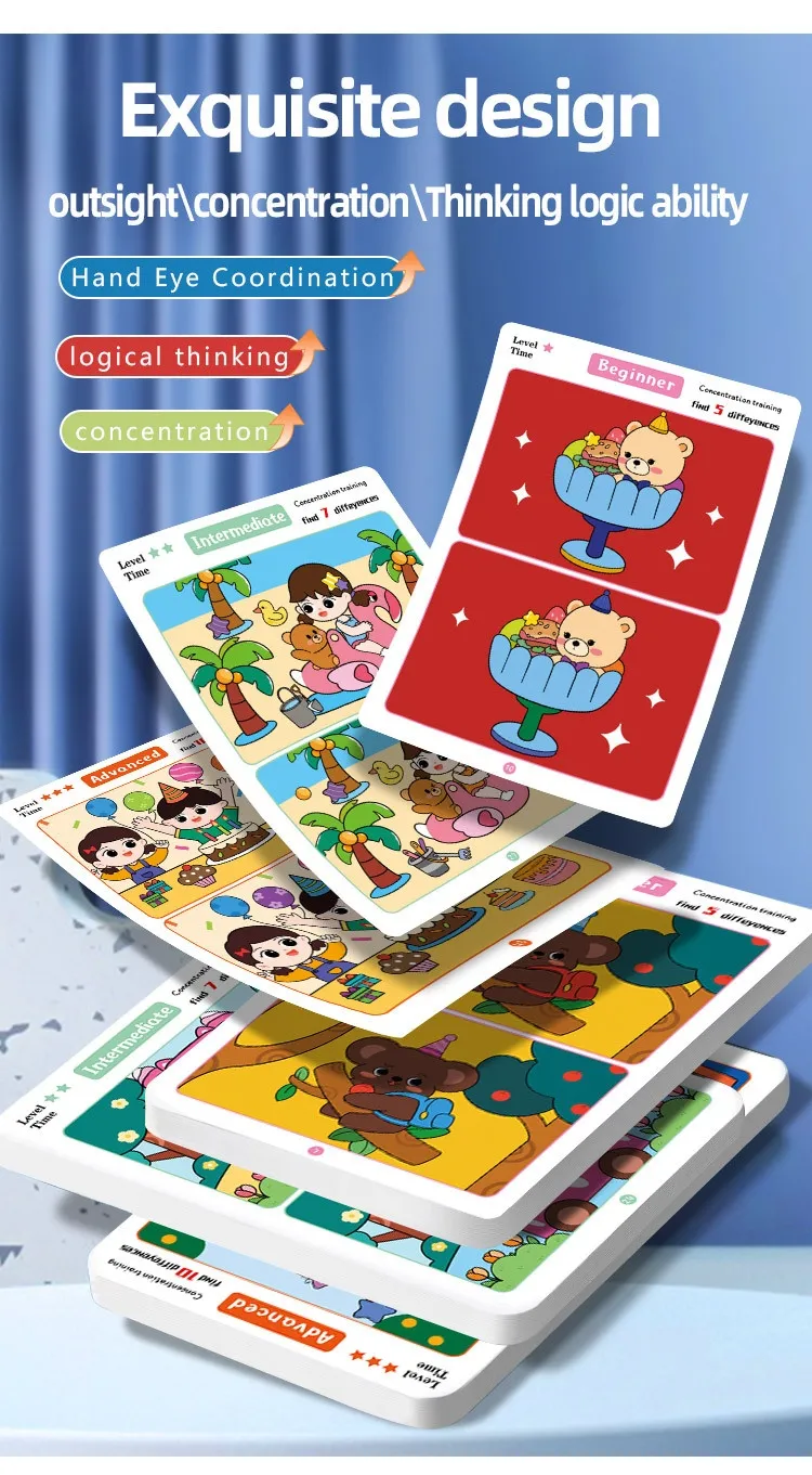 concentration, memory, and cognitive skills. This set of cards features pairs of images with subtle differences that challenge kids to spot