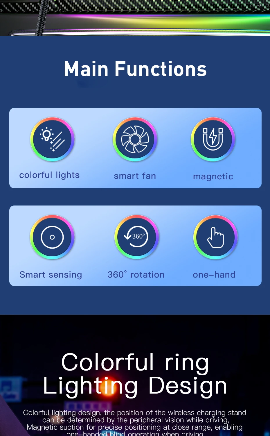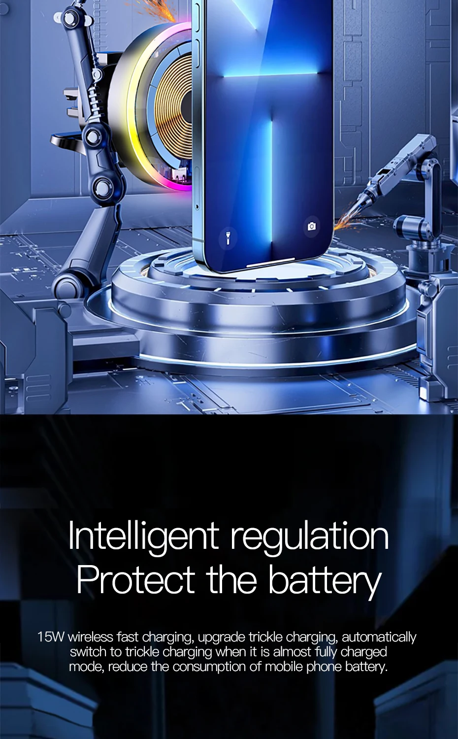 This car charger is designed to provide both secure mounting and fast wireless charging for your phone. The magnetic alignment ensures your phone is perfectly positioned for optimal charging efficiency. The 15W output delivers rapid power to your device, significantly reducing the time needed to reach full battery. The holder supports a wide range of viewing angles, making it ideal for navigation and hands-free calls. The RGB lighting can be customized to match your car’s interior or your personal style, providing an additional layer of aesthetic appeal.