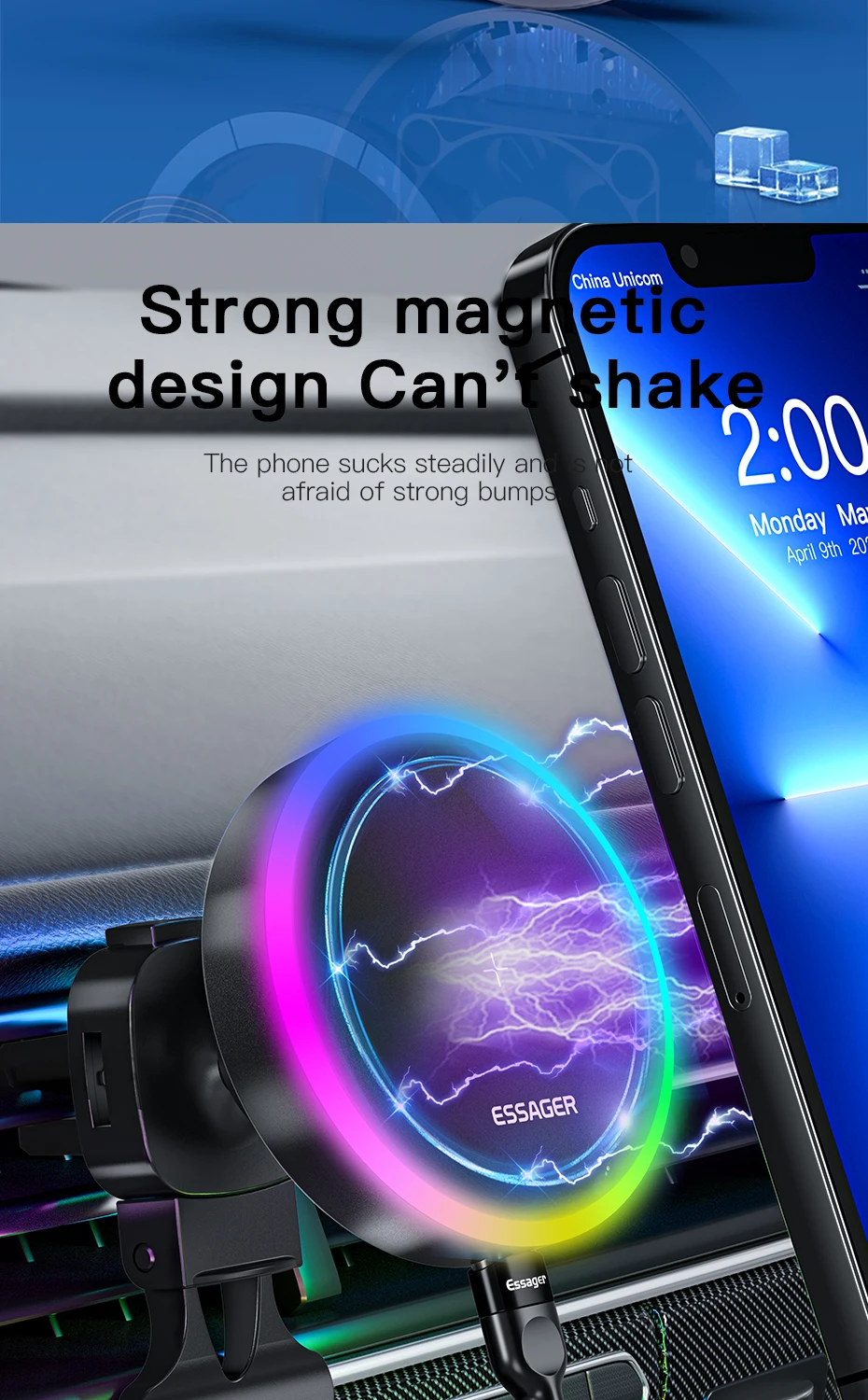 - Can I use this charger with a case on my phone? Yes, the Essager RGB Magnetic Car Phone Holder is designed to work with MagSafe-compatible cases. It may also work with other cases, but magnetic alignment and charging efficiency may vary.