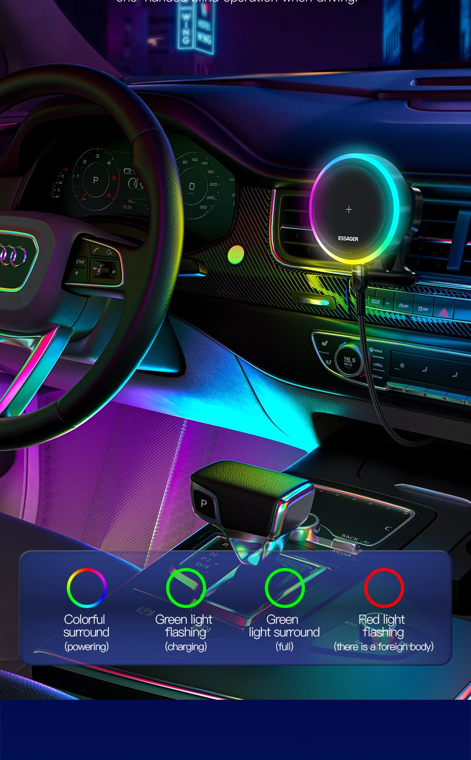 The Essager RGB Magnetic Car Phone Holder features a sleek, modern design that complements any car interior. Constructed from high-quality materials, it boasts a smooth, matte finish that provides a premium feel. The compact, lightweight structure ensures it doesn’t obstruct your view, while the strong magnetic surface securely holds your phone in place. The RGB lighting adds a vibrant touch, with customizable colors that enhance both functionality and style. The charger includes an LED indicator to show charging status, providing a clear visual cue.