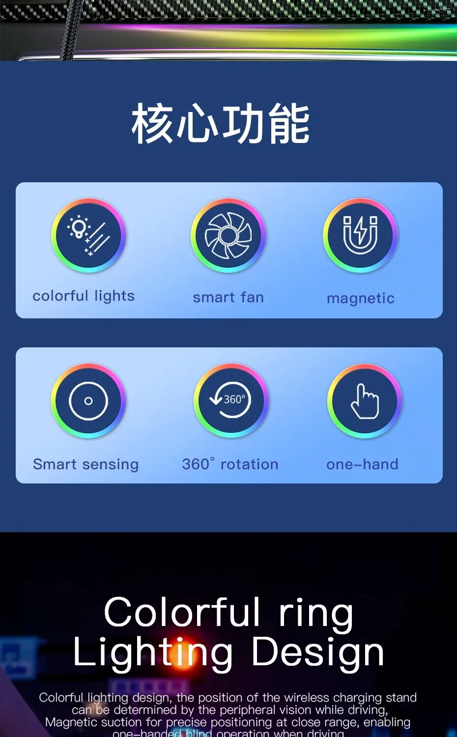 This car charger is designed to provide both secure mounting and fast wireless charging for your phone. The magnetic alignment ensures your phone is perfectly positioned for optimal charging efficiency. The 15W output delivers rapid power to your device, significantly reducing the time needed to reach full battery. The holder supports a wide range of viewing angles, making it ideal for navigation and hands-free calls. The RGB lighting can be customized to match your car’s interior or your personal style, providing an additional layer of aesthetic appeal.