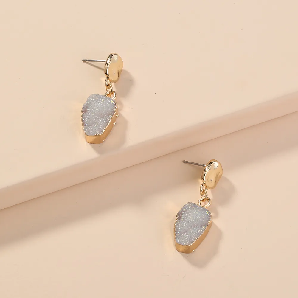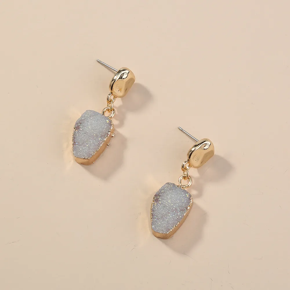 The earrings are inlaid with imitation natural stones, creating a look that mimics the beauty of genuine gemstones while being lightweight and affordable. The stones offer a unique texture and color that adds dimension and depth to the earrings, giving them a natural yet refined look. The cold style of the stones further emphasizes their contemporary and minimalistic vibe, making them perfect for those who appreciate artistic and bold designs.