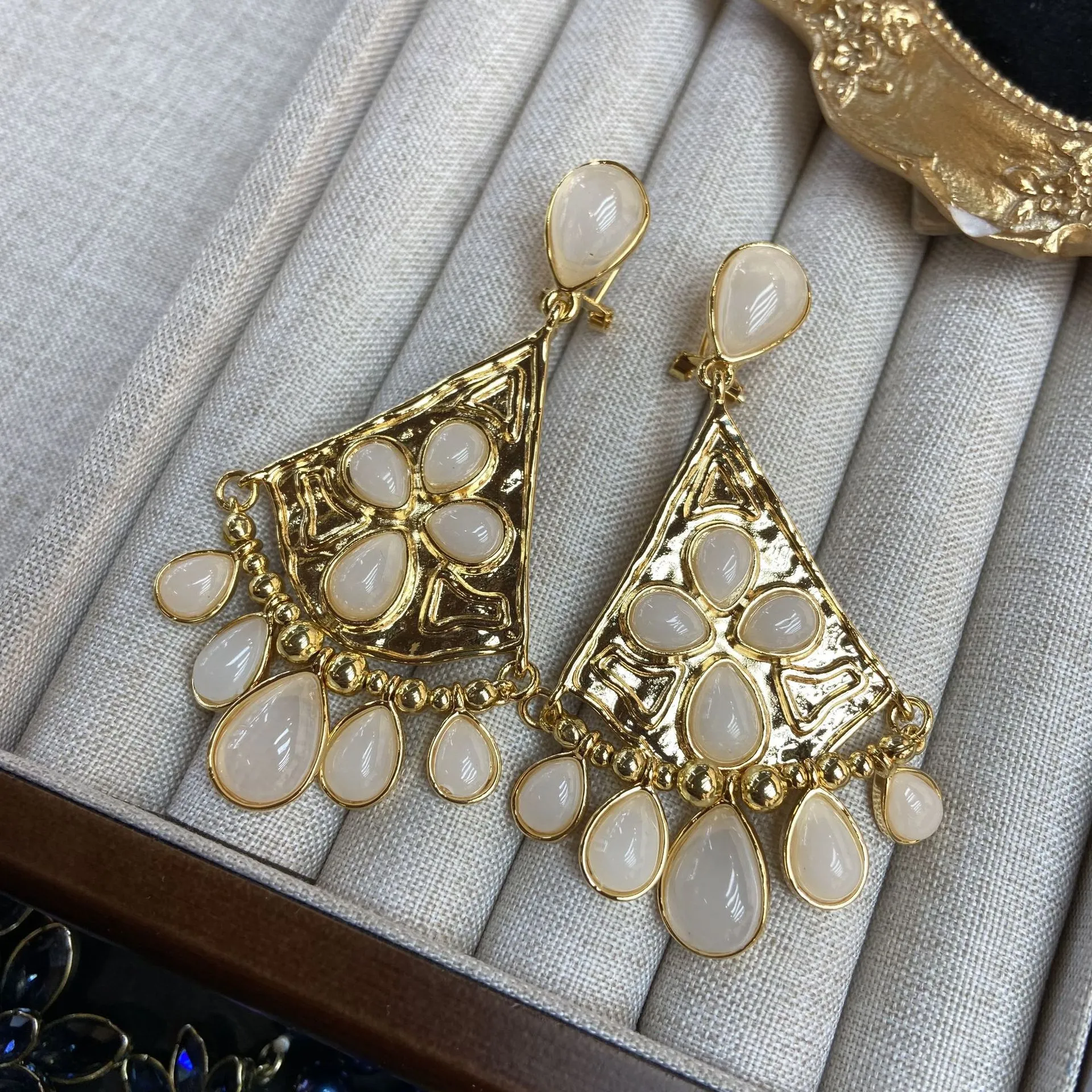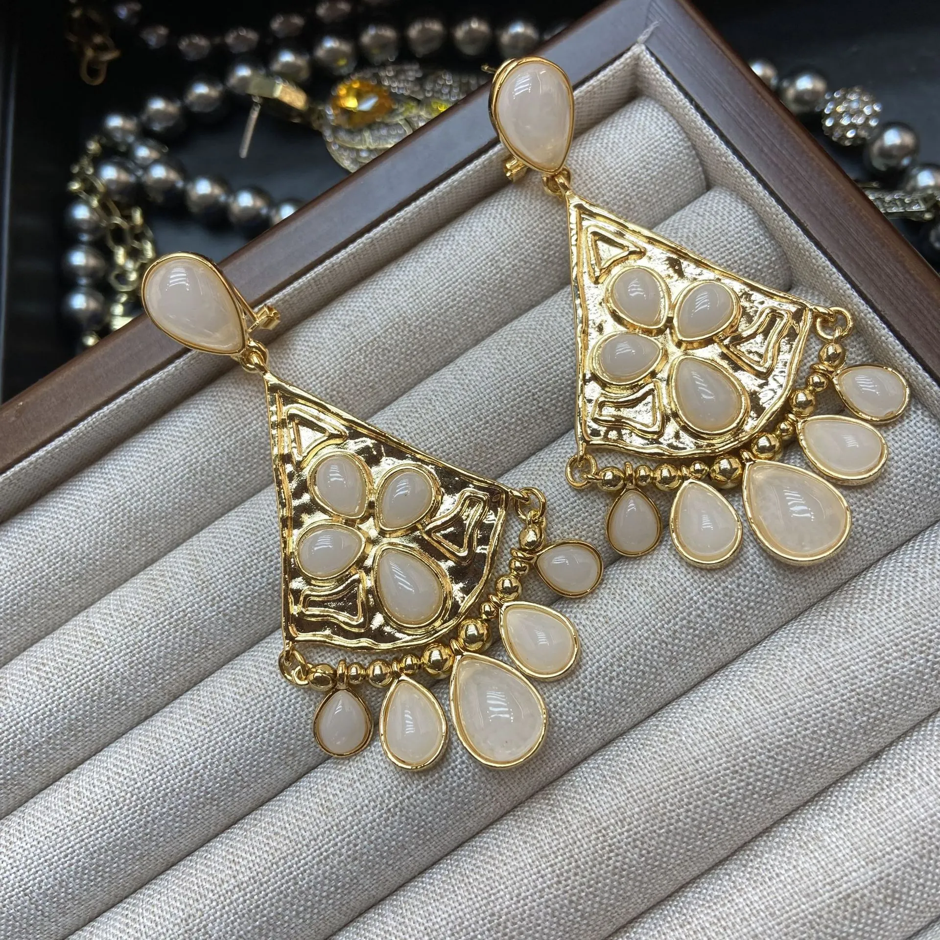 Fan-shaped White Jade Tassel Earrings Water Drop Long Ear Studs