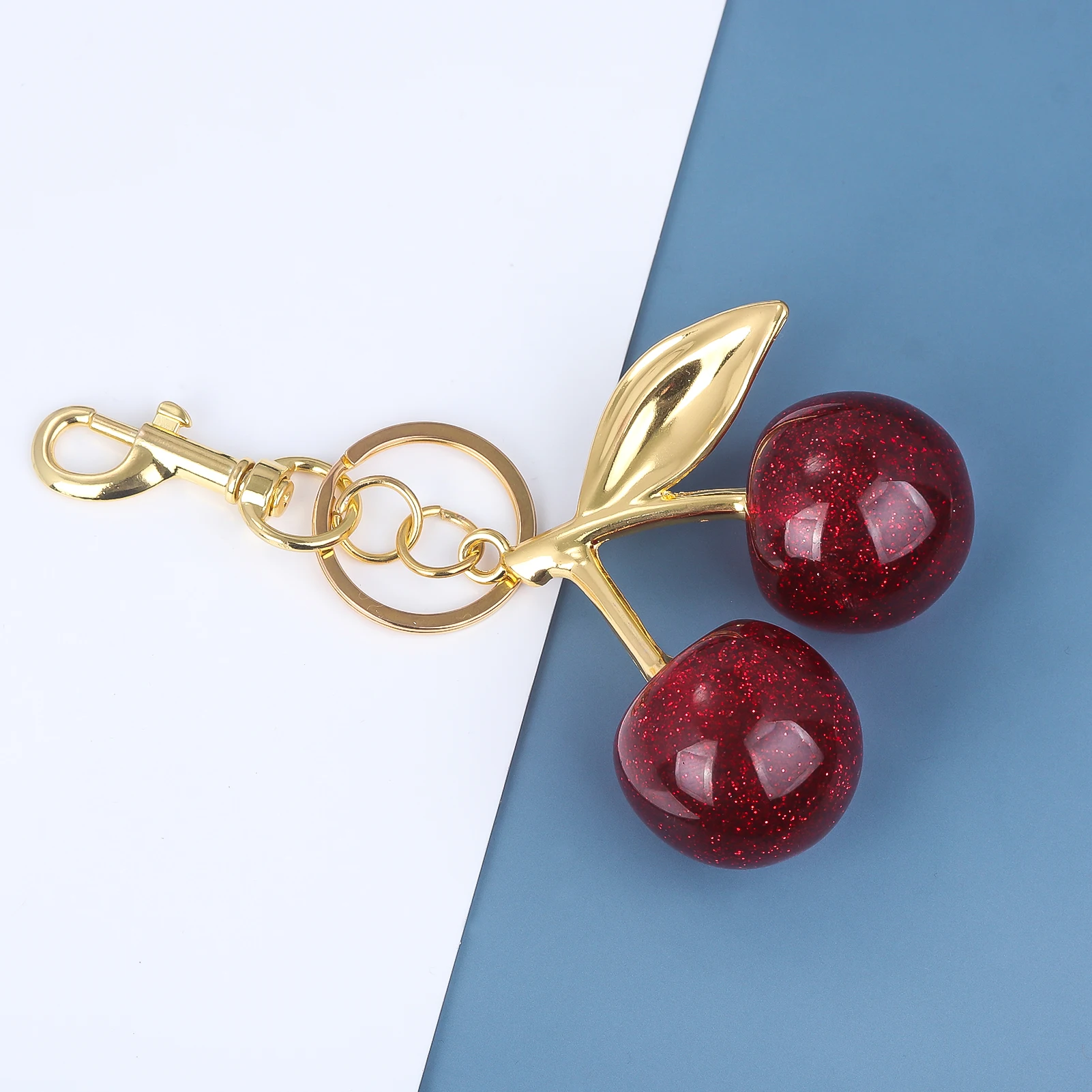 This keychain features bright red cherries crafted with high attention to detail, giving it a realistic look that will instantly catch the eye. The cherry pendants have a glossy finish that enhances their vibrant color, making them look fresh and appetizing.