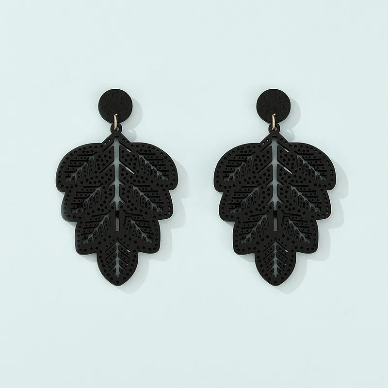 These earrings feature an intricately carved leaf motif, symbolizing growth, nature, and timeless beauty. The black wooden finish adds a modern yet earthy aesthetic, making them a versatile accessory for any occasion.