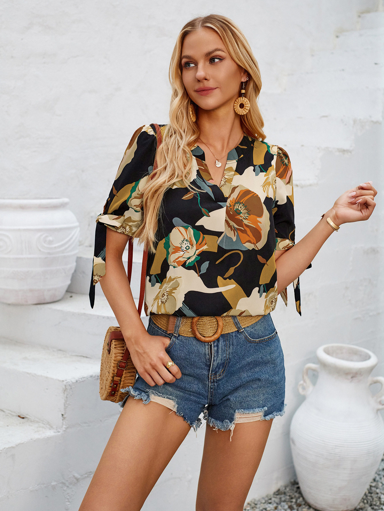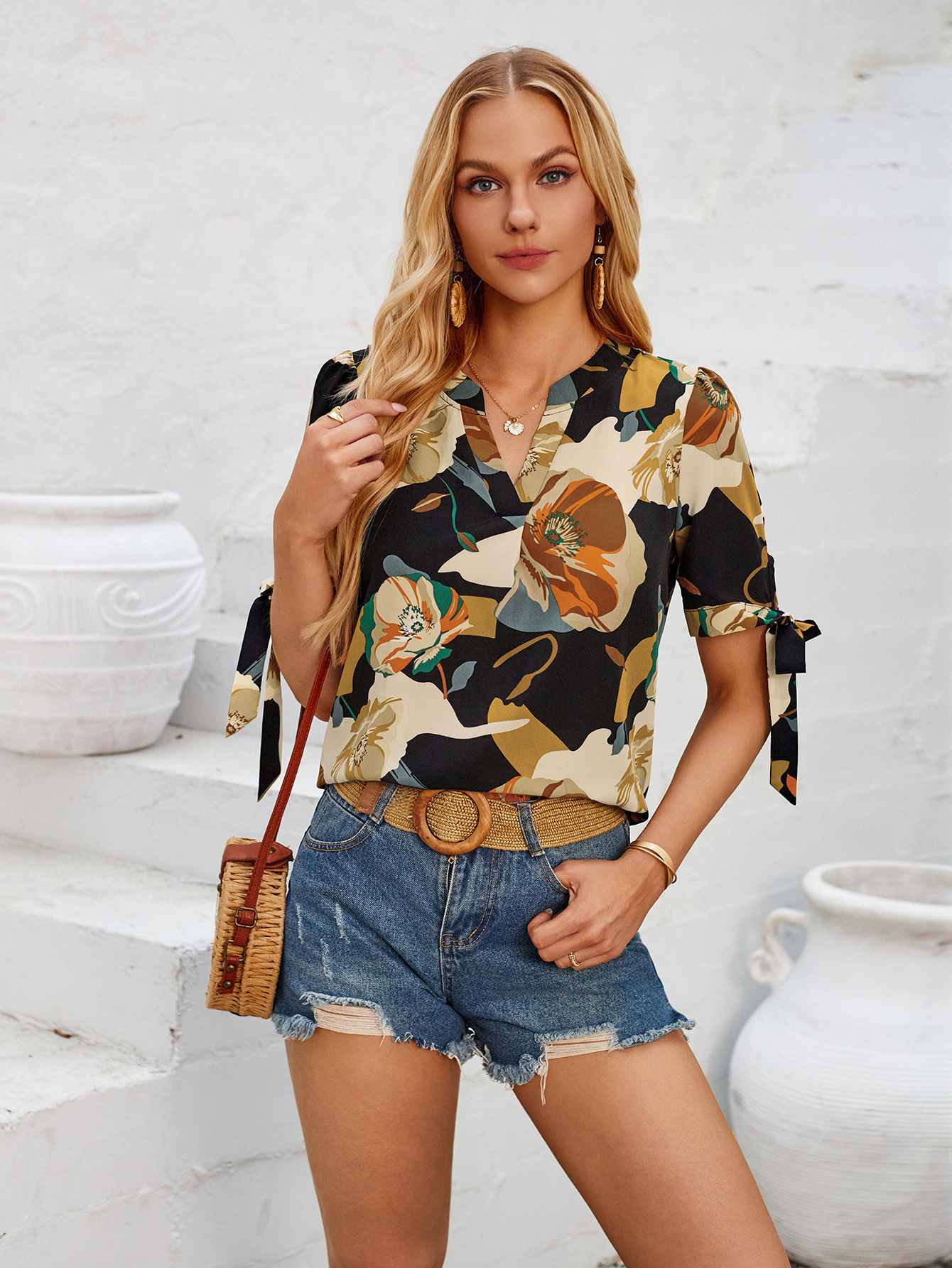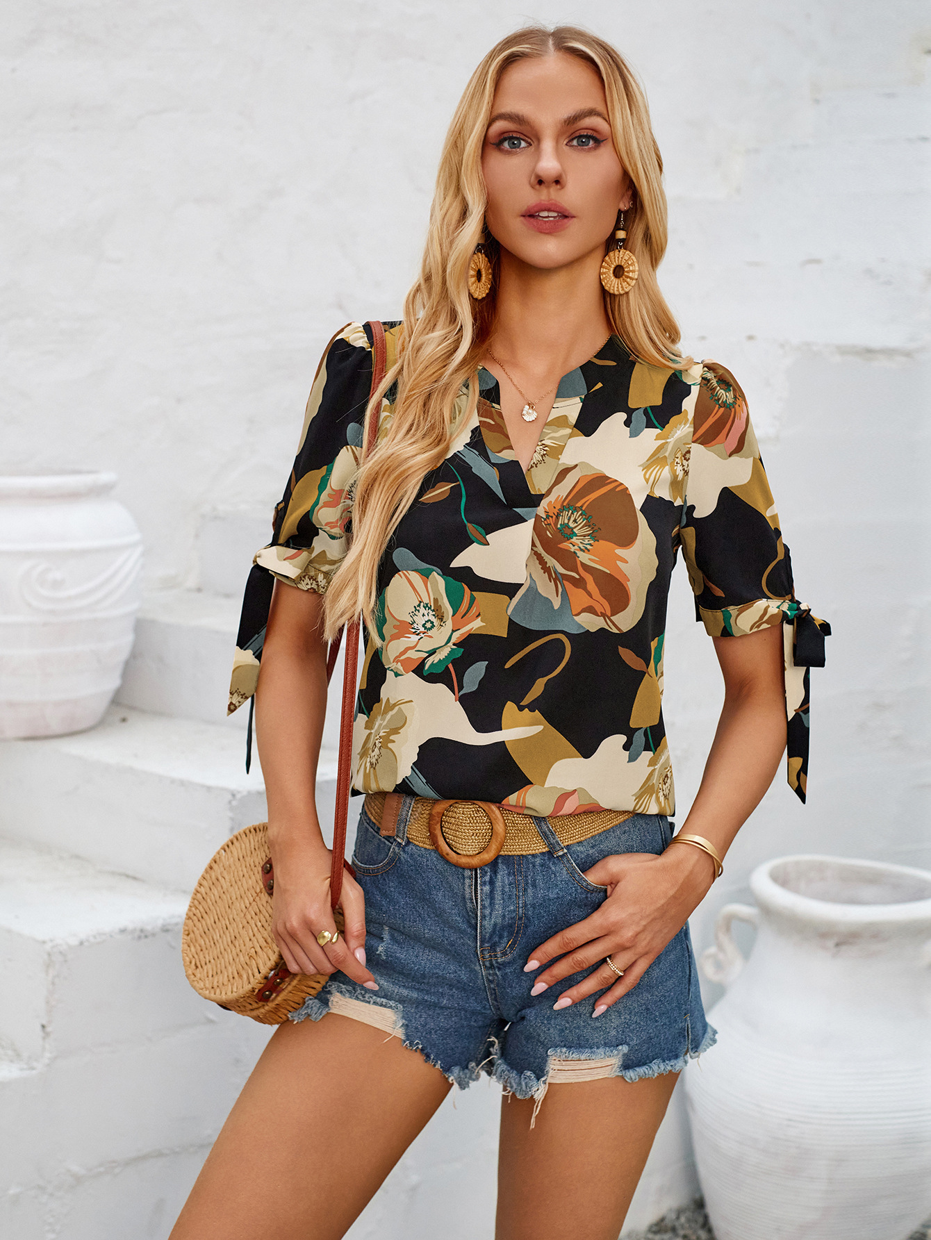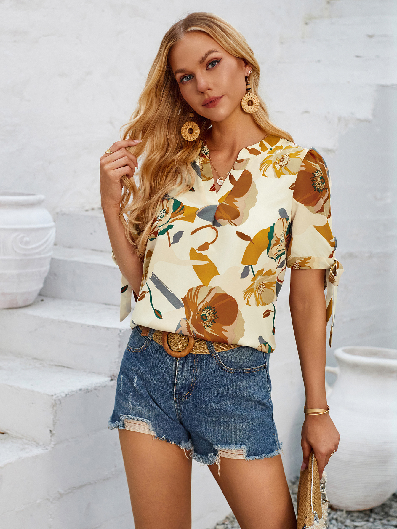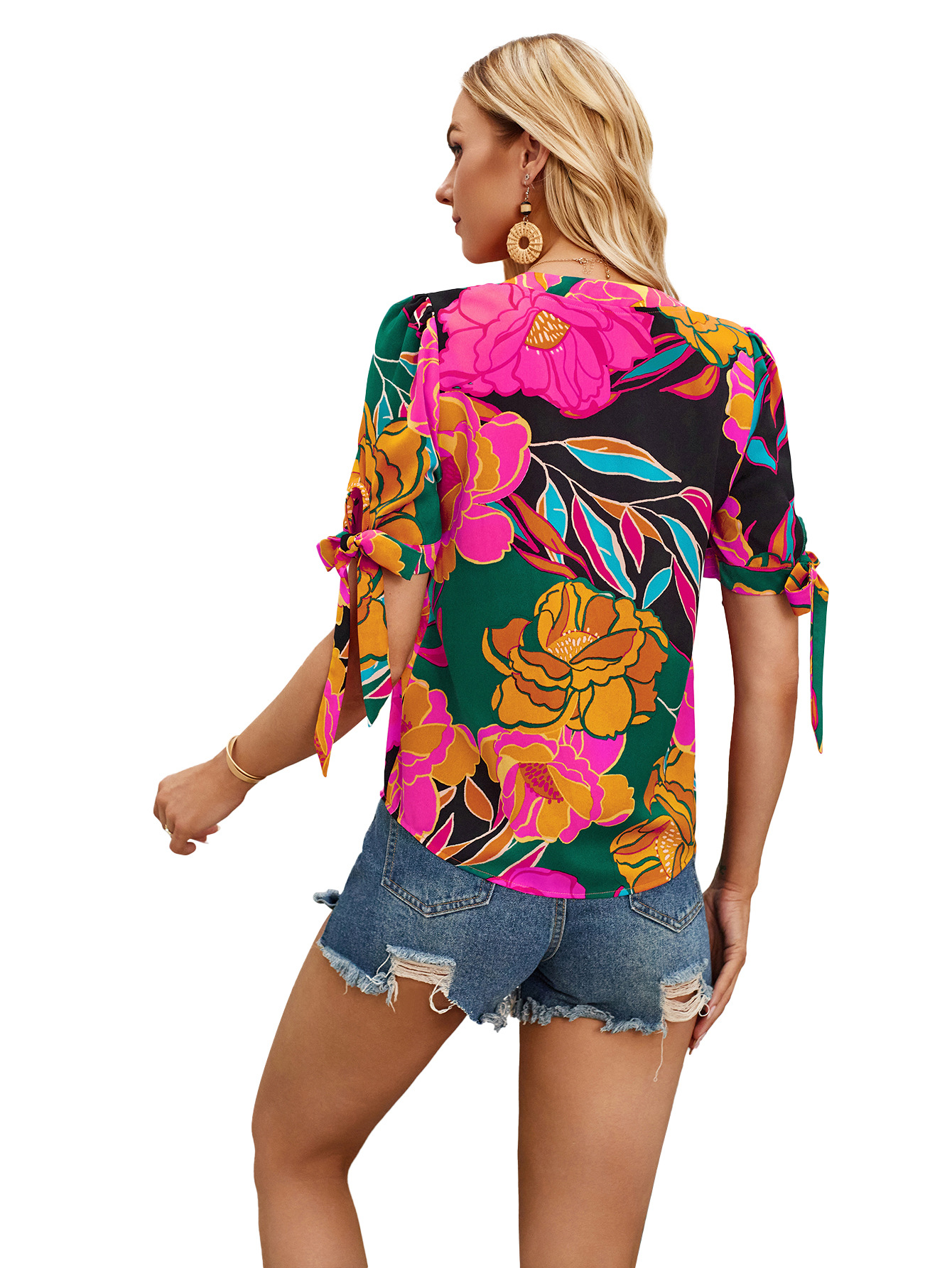 Refresh your casual collection with our Fashion Printed Casual V-Neck Cuff Bundle Top. This trendy top features a fashionable V-neck design